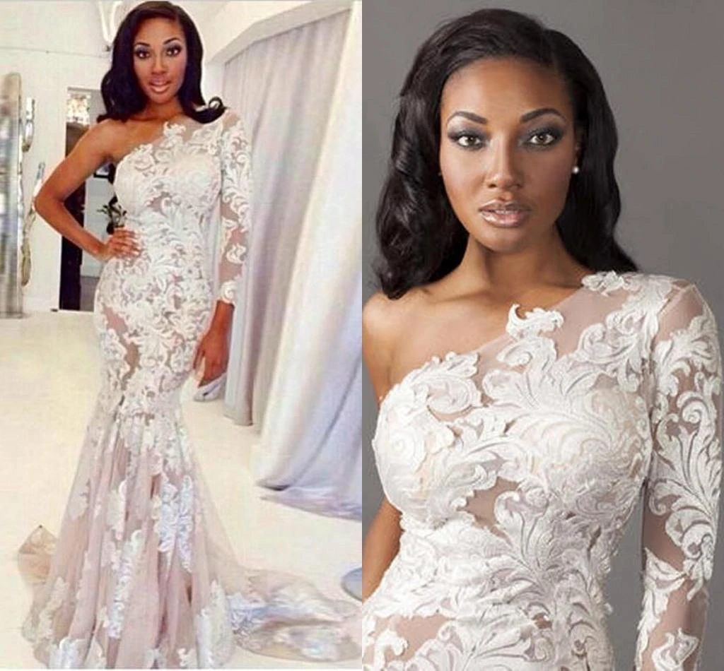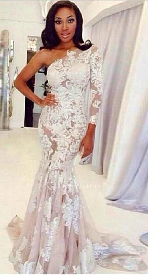 Sexy One-shoulder Mermaid Evening Dress Lace Appliques Sweep Train