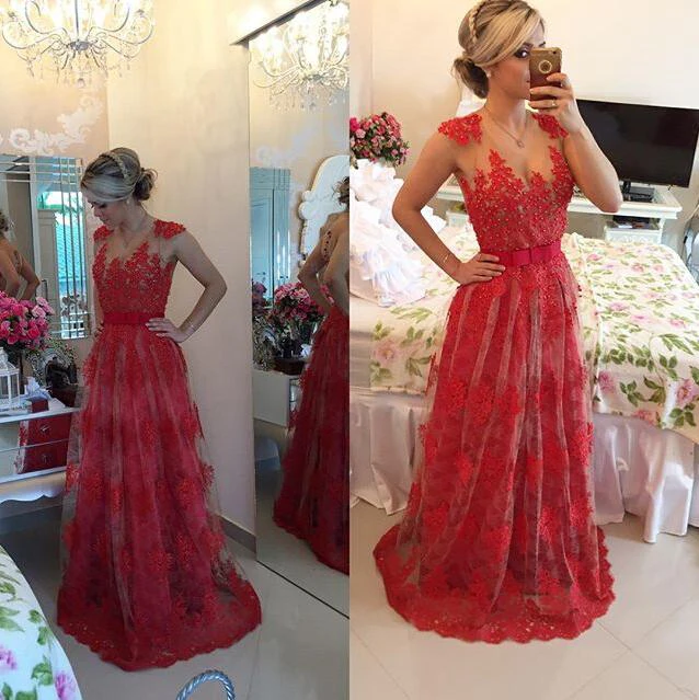 Sexy Red Pearls Lace Evening Dress Sheer Floor-Length