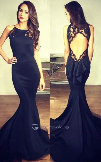Sexy Satin Mermaid Bateau Sleeveless Evening Dress With Keyhole Lace Ruffles