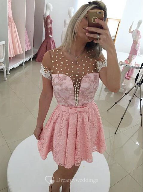 Sexy Short Sleeve Pink Cocktail Dress Lace Pearls