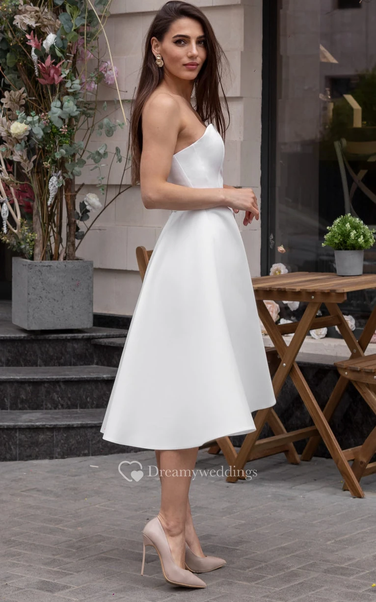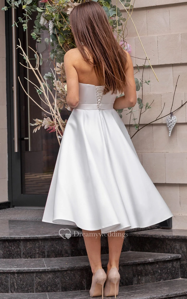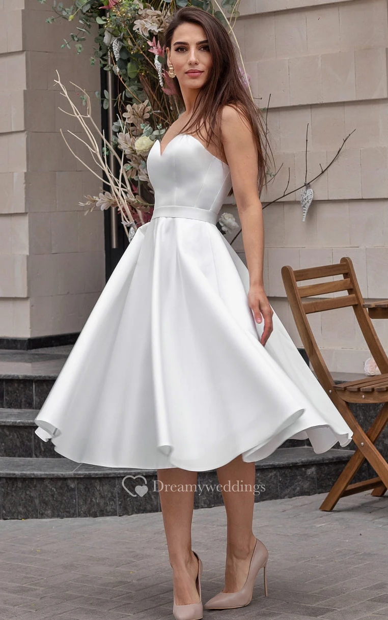 Sexy Sleeveless Tea-length Satin A Line Wedding Dress with Ribbon
