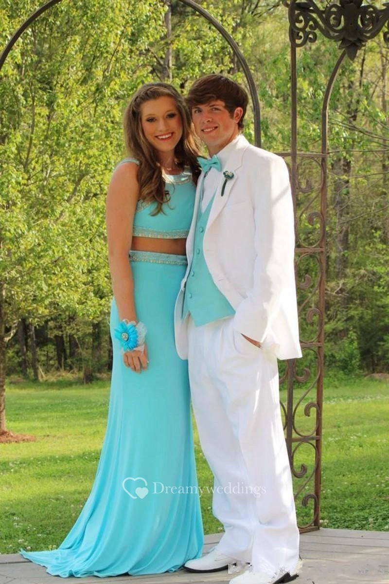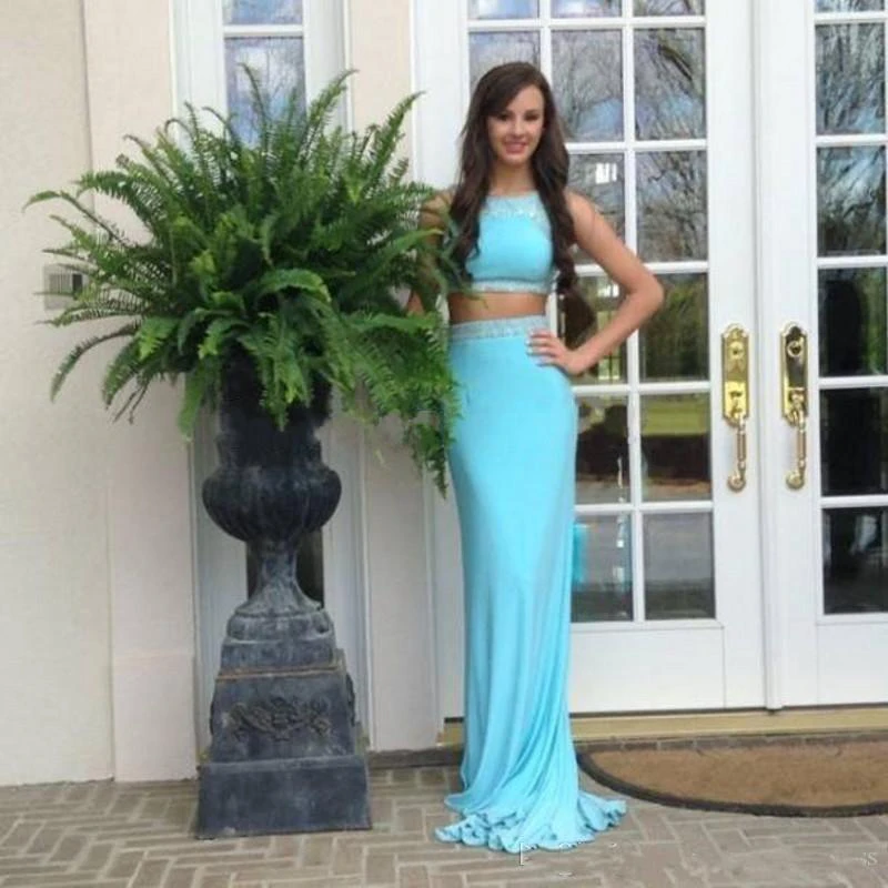 Sexy Two Piece Mermaid Beadings Prom Dress Jewel Sweep Train Sleeveless