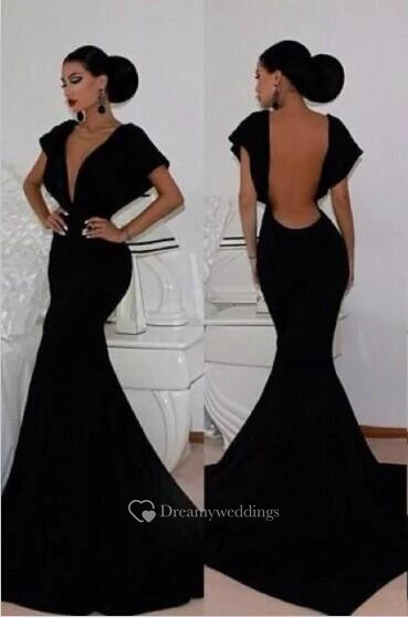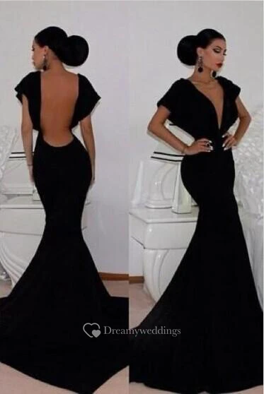 Sexy V-neck Black Mermaid Prom Dress Open Back