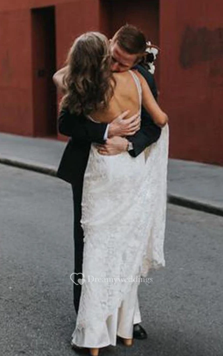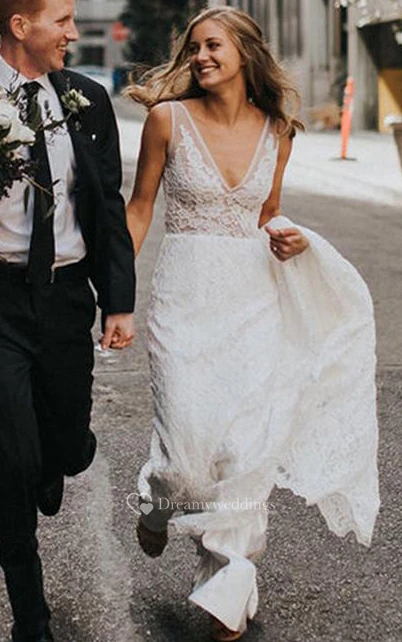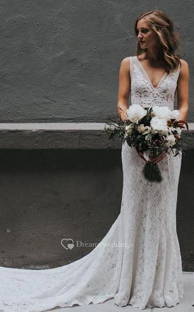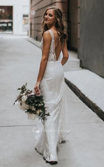 Sexy V-neck Lace Sheath Floor-length Chapel Train Sleeveless Wedding Dress