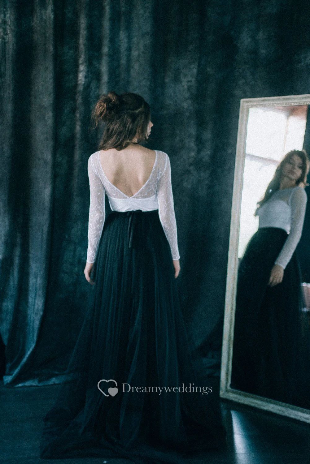 Sheath Black Wedding Dress Bateau Neck Long Sleeve Deep-V Back Lace With Pleats