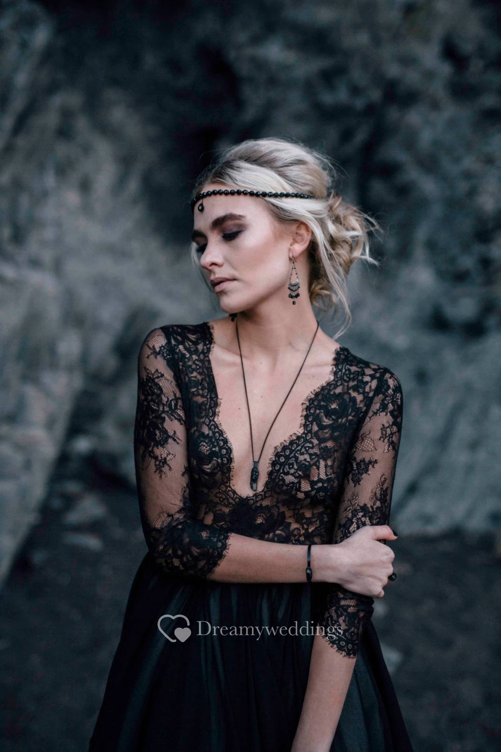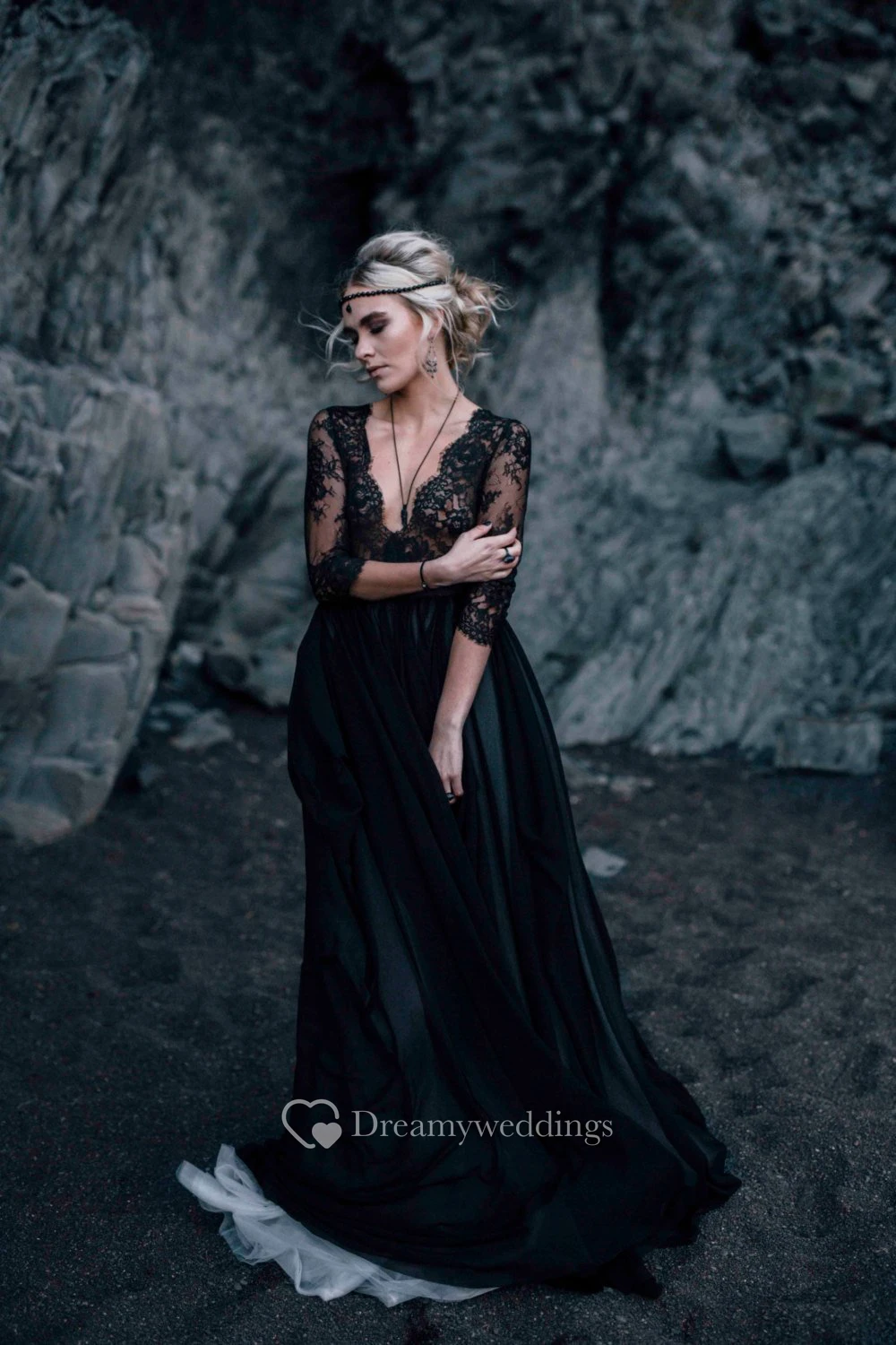 Sheath Black Wedding Dress V-neck 3/4 Length Sleeve Button Illusion Back With Lace