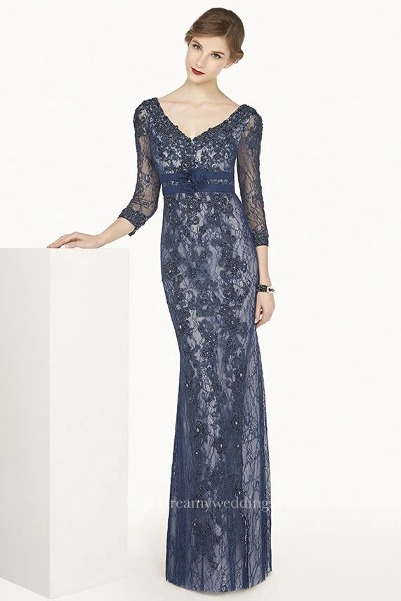 Sheath 3-4-Sleeve Floor-Length Appliqued V-Neck Lace Prom Dress With Beading And Flower