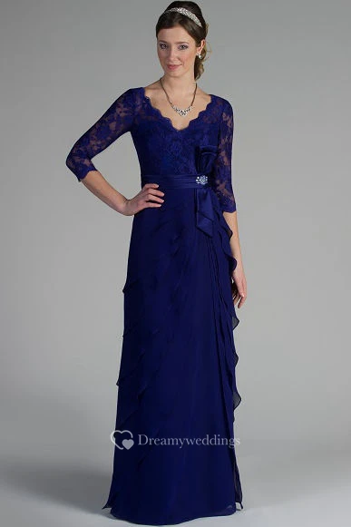 Sheath 3-4-Sleeve Floor-Length V-Neck Draped Lace&Chiffon Mother Of The Bride Dress With Broach