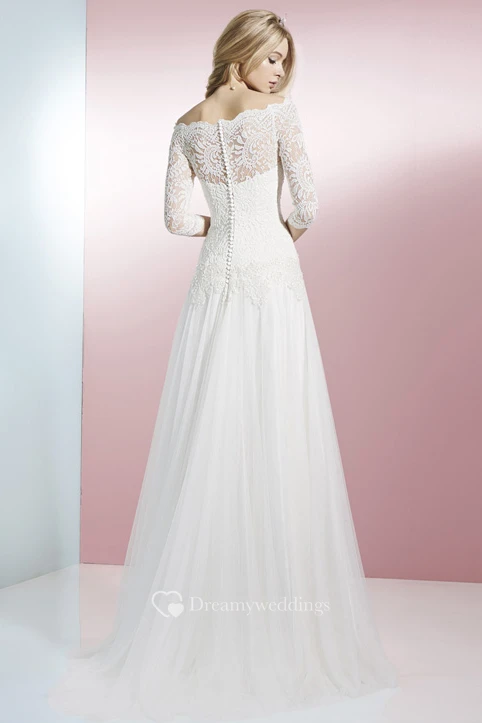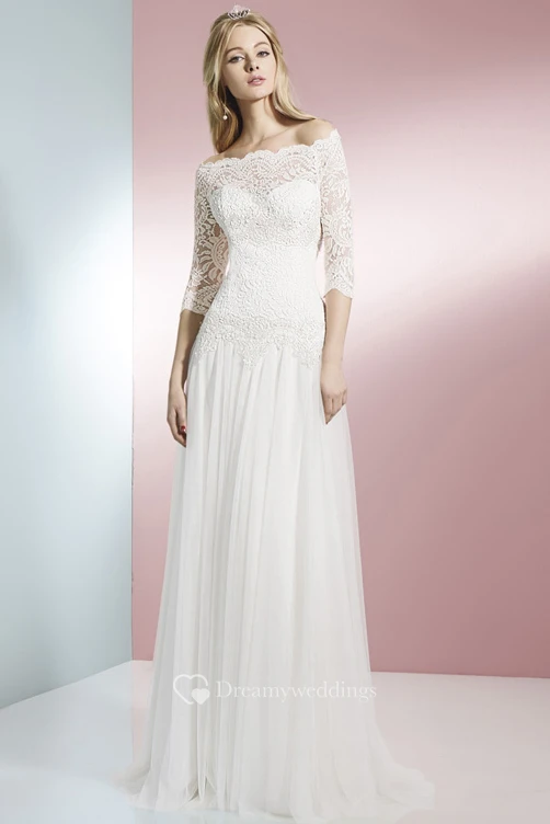 Sheath 3-4 Sleeve Off-The-Shoulder Lace Tulle Wedding Dress With Brush Train