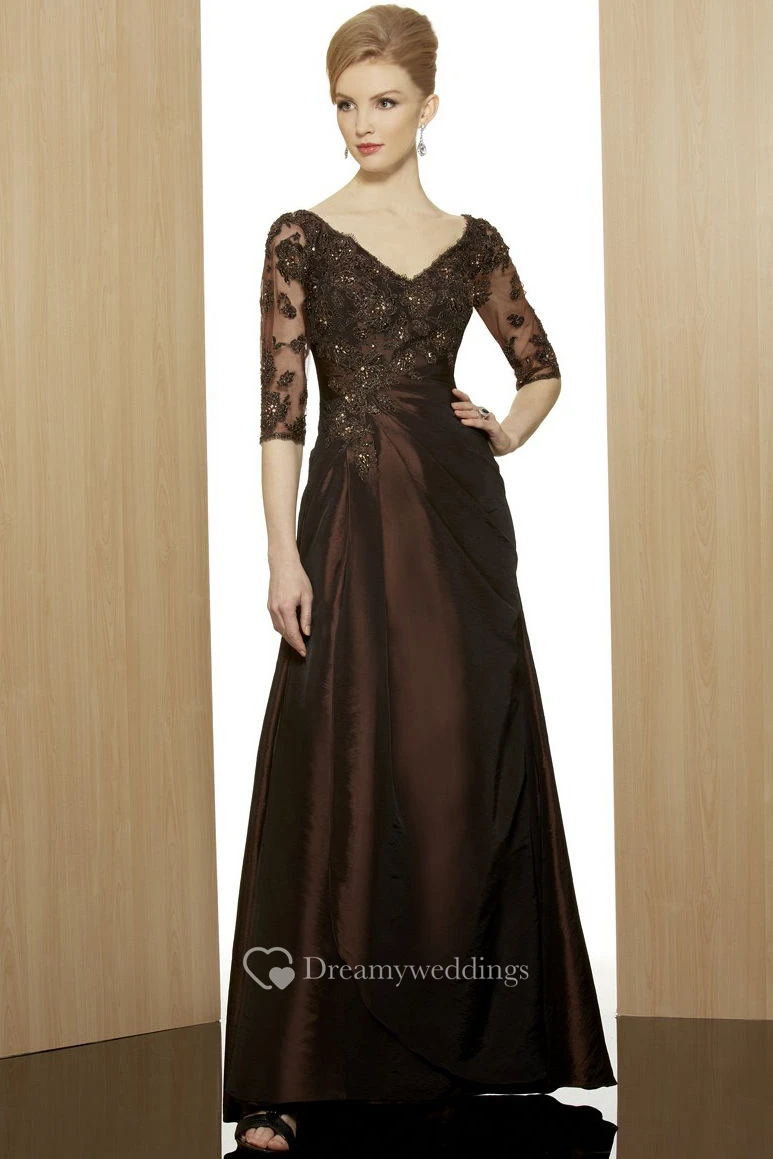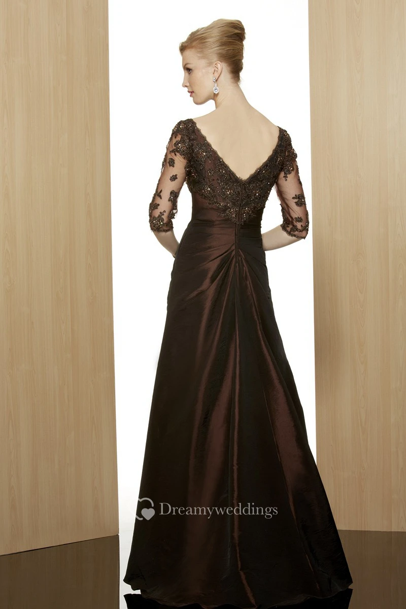Sheath Ankle-Length Appliqued Half-Sleeve V-Neck Satin Formal Dress With Beading