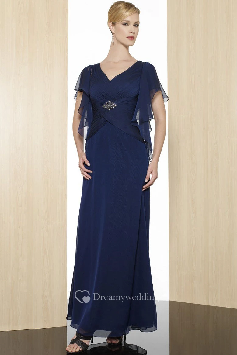 Sheath Ankle-Length Broach V-Neck Poet-Short-Sleeve Chiffon Formal Dress With Low-V Back And Ruching