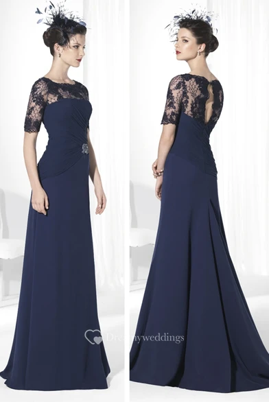Sheath Bateau-Neck Floor-Length Short-Sleeve Lace Chiffon Prom Dress With Broach