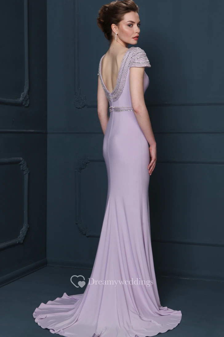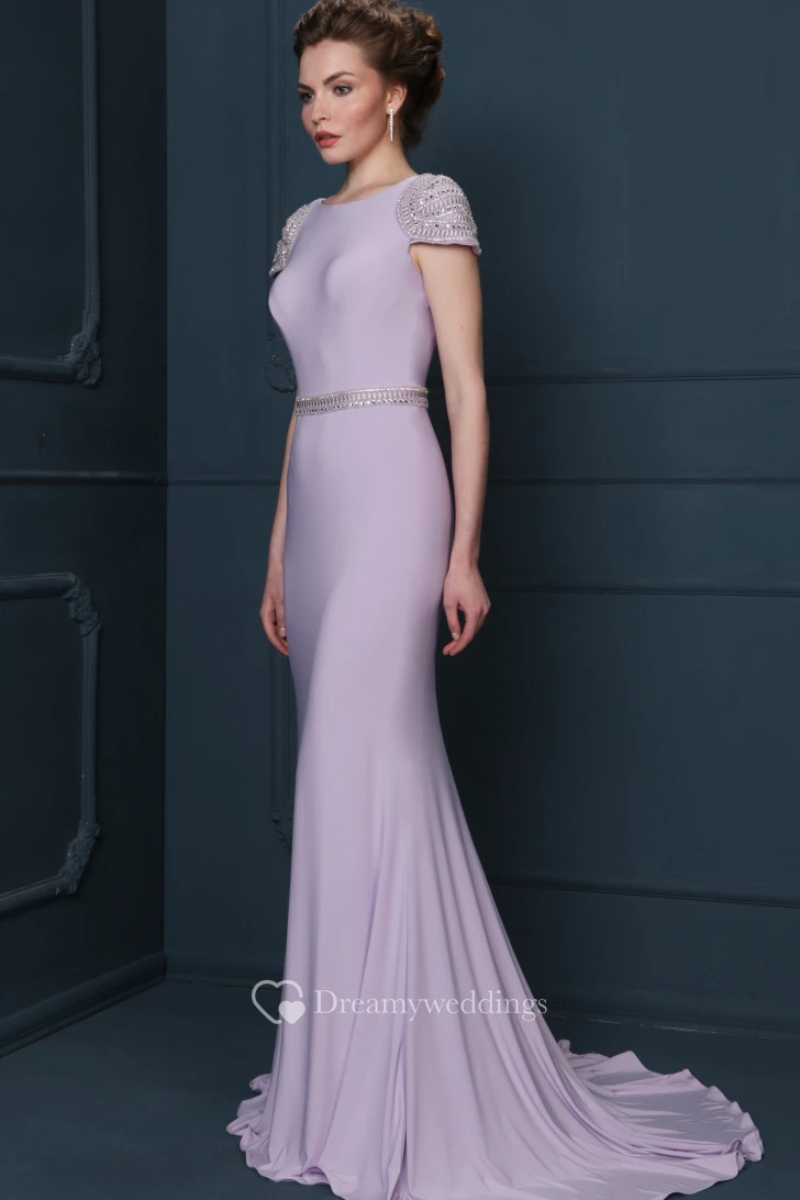 Sheath Beaded Floor-Length Jewel-Neck Cap-Sleeve Jersey Evening Dress With Waist Jewellery