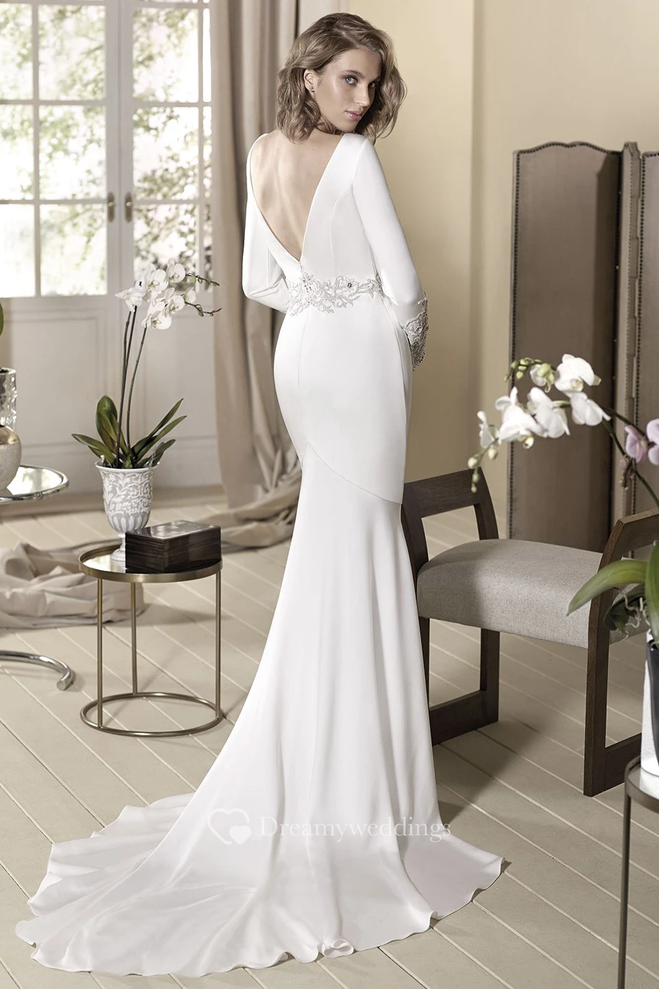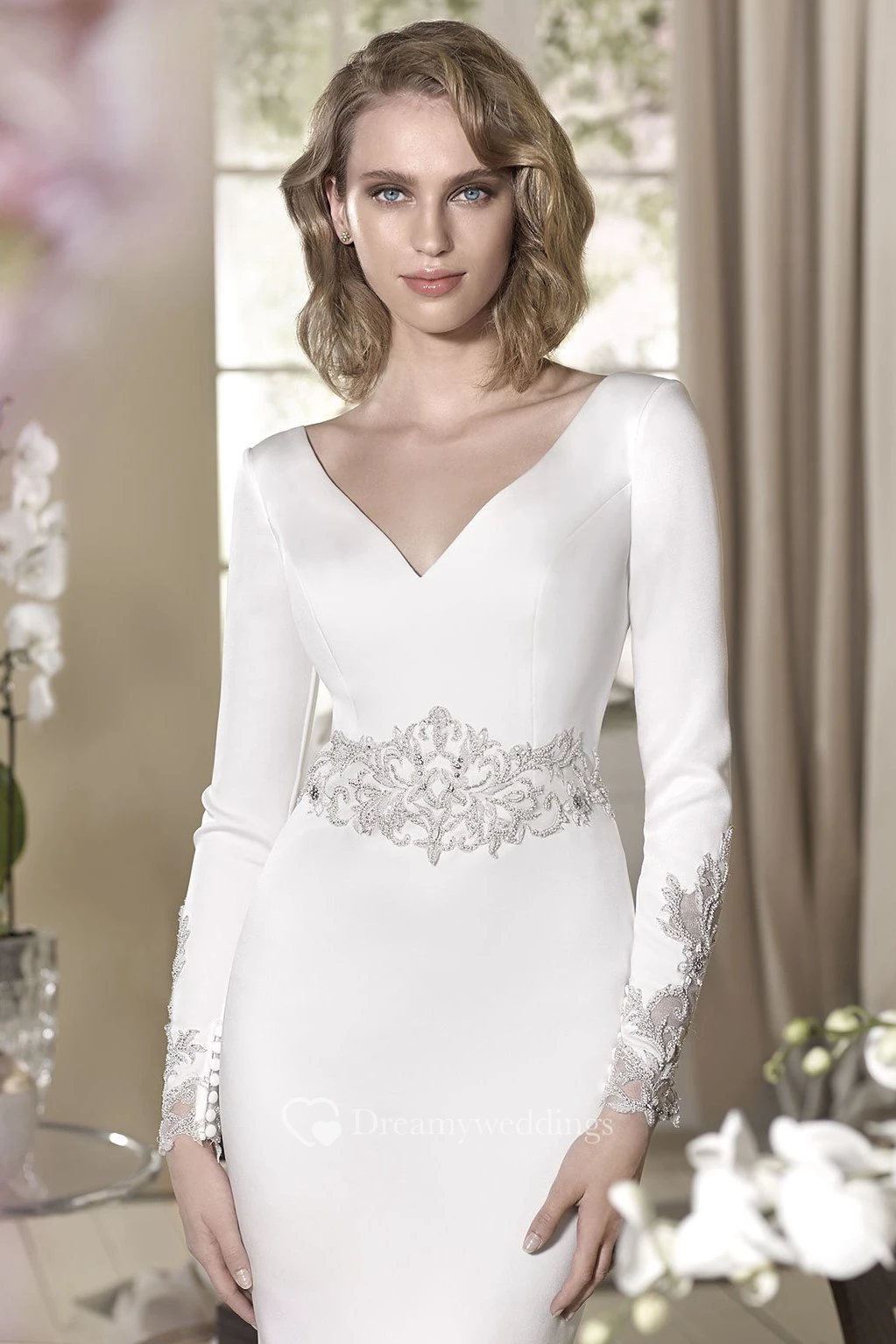 Sheath Beaded Long-Sleeve Floor-Length V-Neck Jersey Wedding Dress
