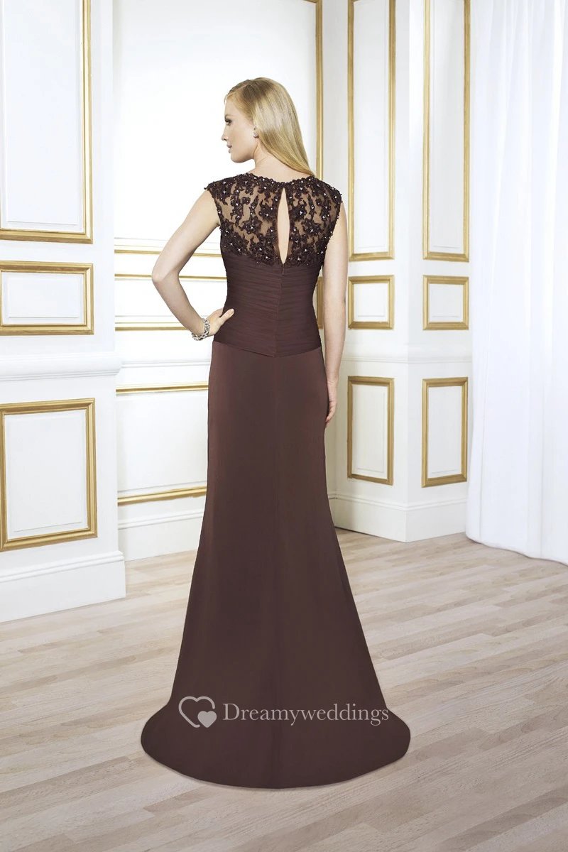 Sheath Cap-Sleeve Appliqued Floor-Length Scoop Chiffon Formal Dress With Illusion Back And Draping