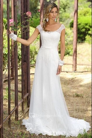 Sheath Cap-Sleeve Scoop-Neck Tulle Wedding Dress With Lace And Sweep Train