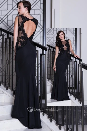 Sheath Floor-Length Lace Sleeveless Bateau Chiffon Prom Dress With Keyhole Back