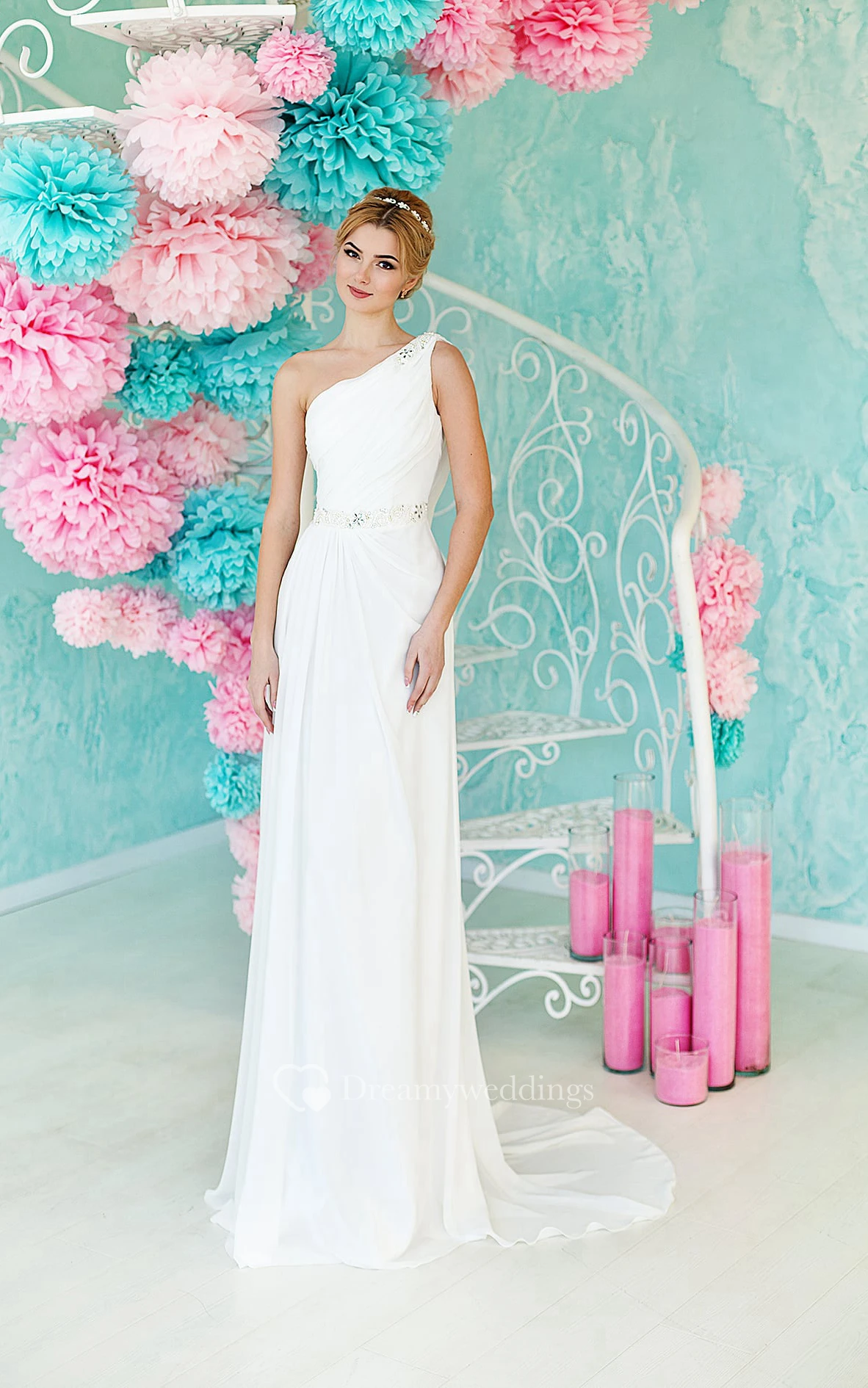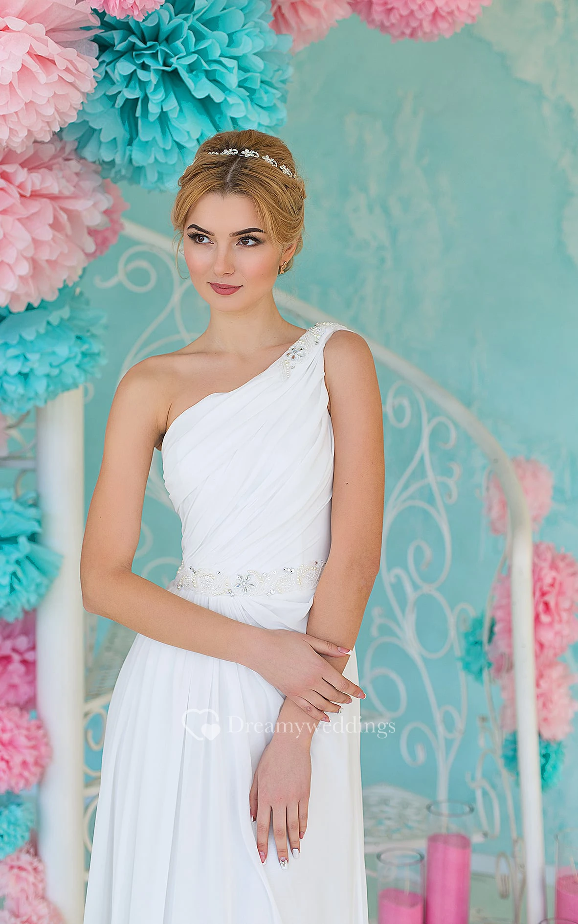 Sheath Floor-Length One-Shoulder Sleeveless Lace-Up Chiffon Dress With Ruching And Beading