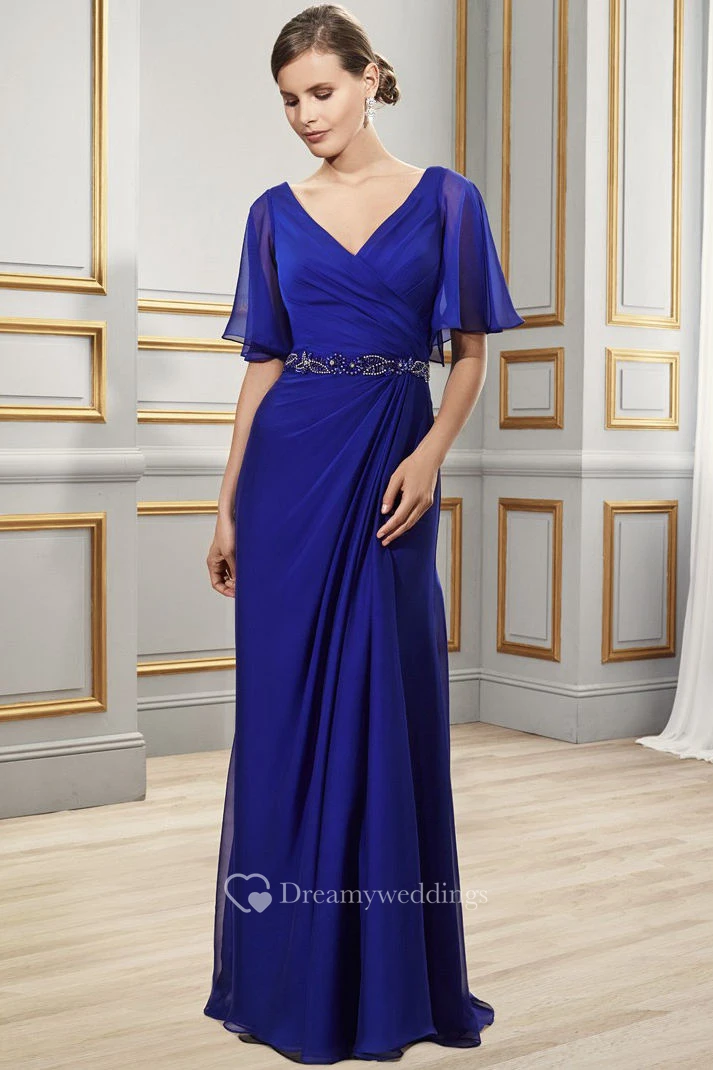 Sheath Floor-Length Side-Draped Poet-Short-Sleeve V-Neck Chiffon Formal Dress With Low-V Back And Waist Jewellery