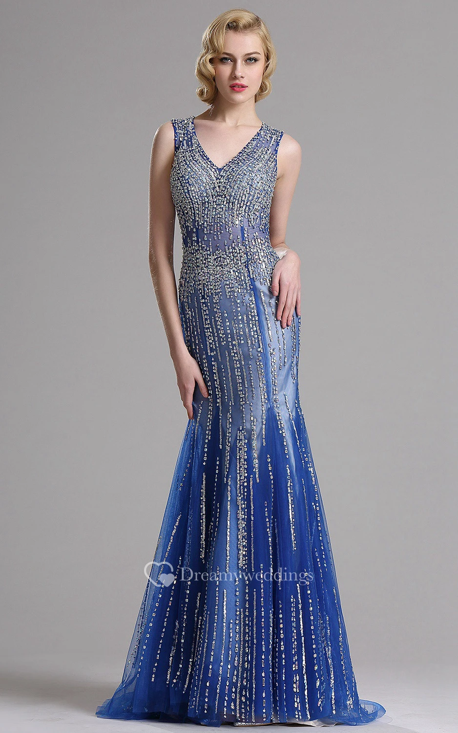Sheath Floor-Length Sweep V-Neck Sleeveless Tulle Beading Keyhole Dress