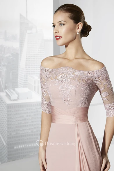 Sheath Half-Sleeve Off-The-Shoulder Appliqued Maxi Chiffon Prom Dress