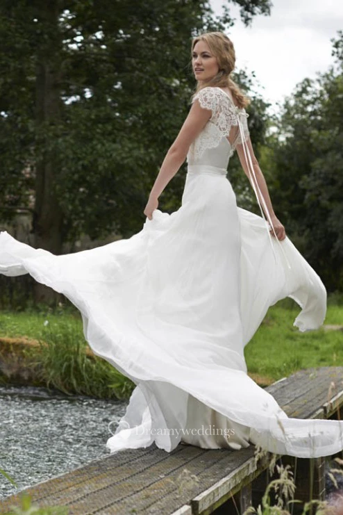 Sheath Jewel-Neck Poet-Sleeve Maxi Lace&Chiffon Wedding Dress With Cape