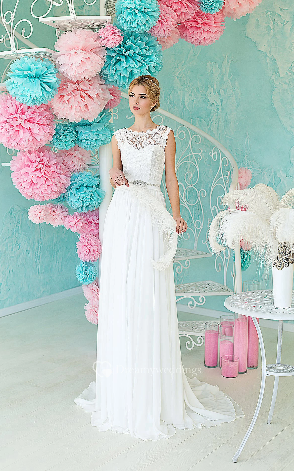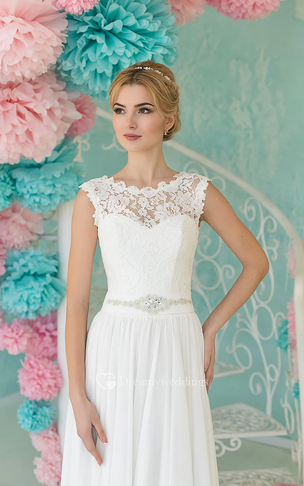 Sheath Long Scoop Sleeveless Lace-Up Chiffon Dress With Lace And Beading
