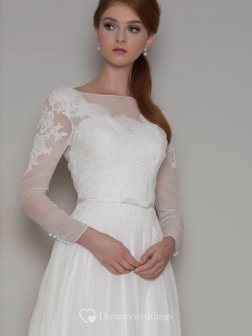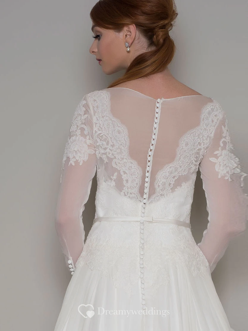 Sheath Long-Sleeve Bateau-Neck Chiffon Wedding Dress With Illusion