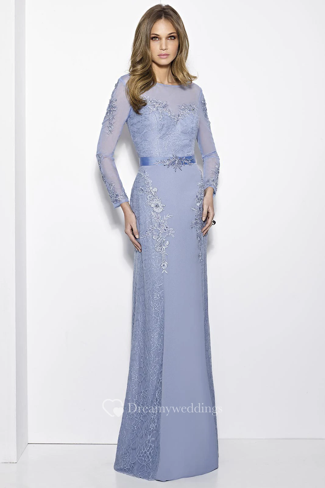 Sheath Long-Sleeve Jewel-Neck Lace Long Prom Dress With Appliques