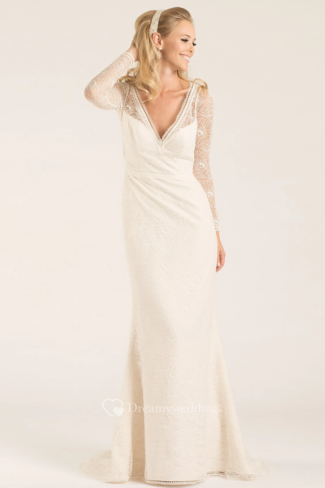 Sheath Long-Sleeve V-Neck Lace Wedding Dress With Keyhole
