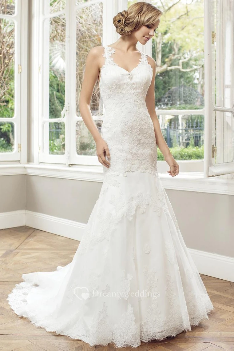 Sheath Maxi Appliqued Sleeveless V-Neck Lace Wedding Dress With Court Train And Backless Style