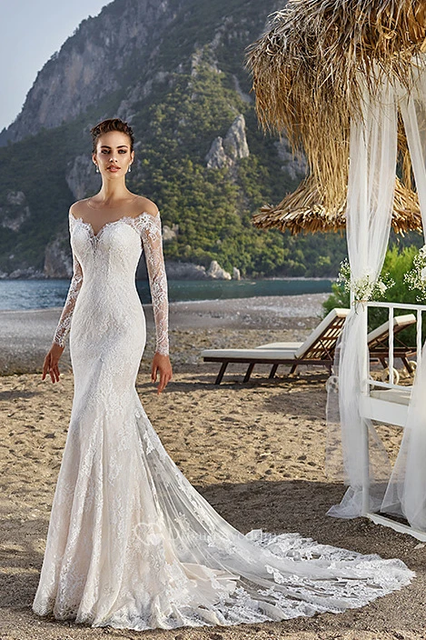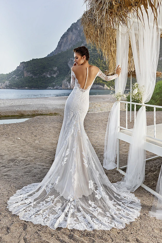 Sheath Off-The-Shoulder Long-Sleeve Lace Wedding Dress With Illusion