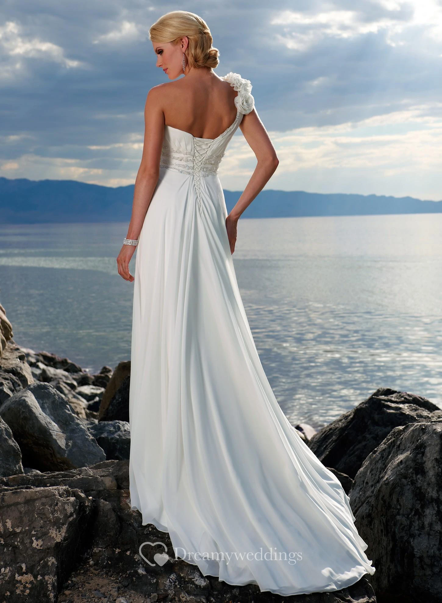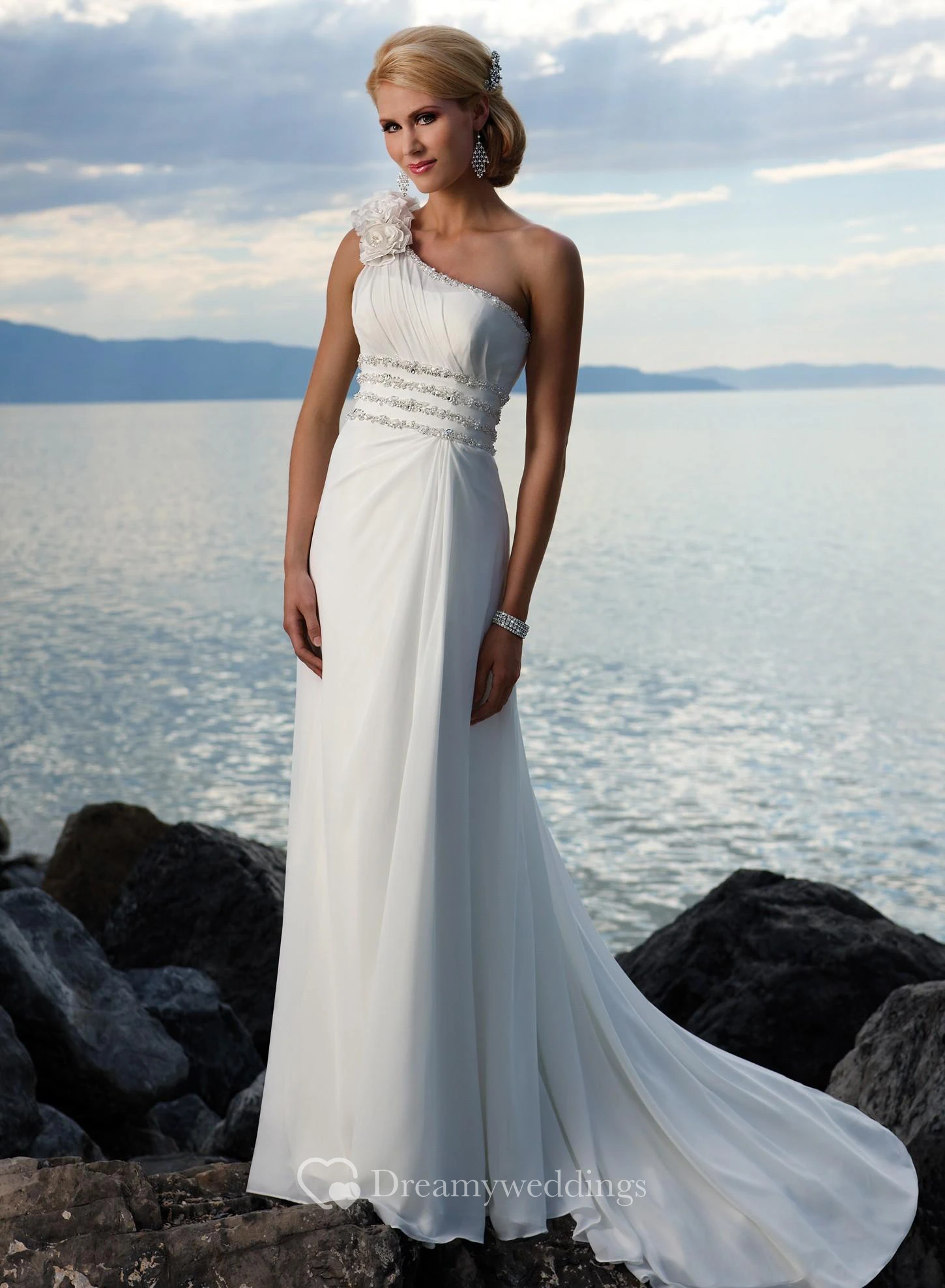 sheath One Shoulder Hand-made Flower Chiffon Sweep Train Wedding Dress