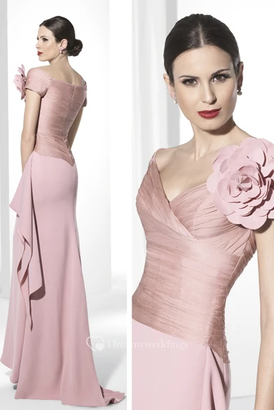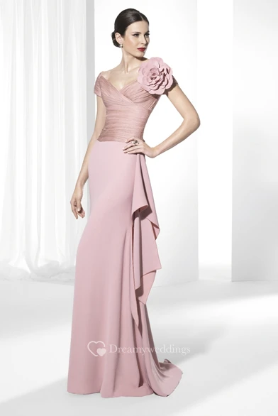 Sheath Ruched Short-Sleeve Floor-Length V-Neck Jersey Prom Dress With Flower And Draping