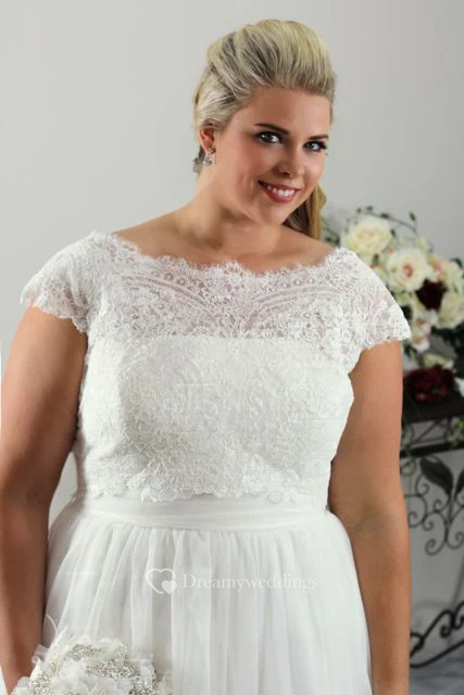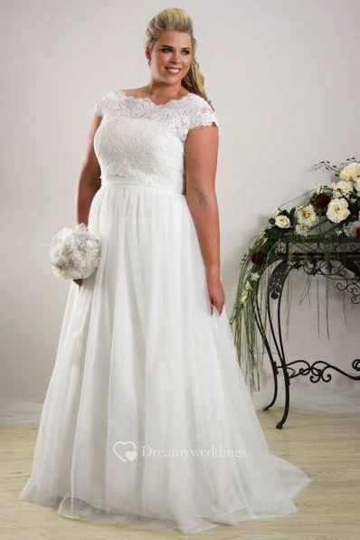Sheath Scoop-Neck Long Cap-Sleeve Tulle Plus Size Wedding Dress With Appliques