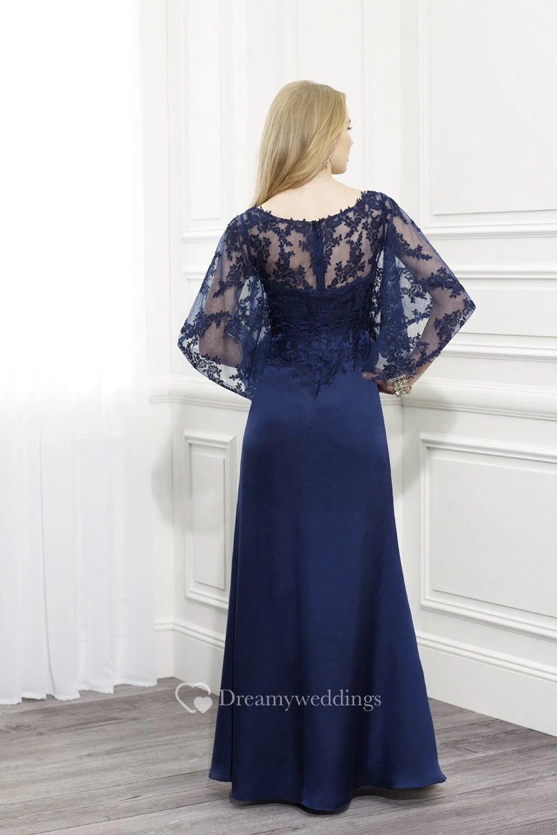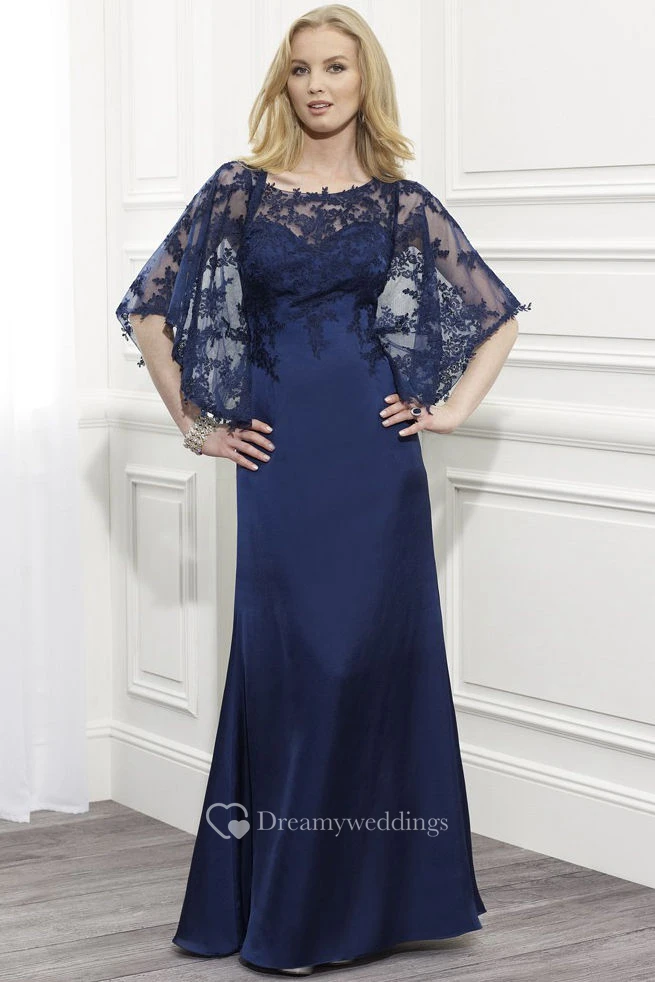 Sheath Scoop-Neck Maxi Appliqued Bat-Sleeve Satin Formal Dress With Cape