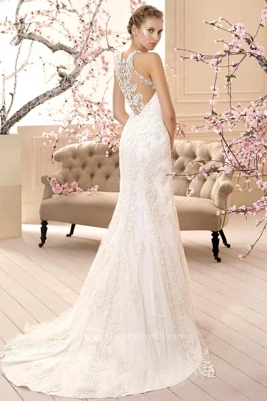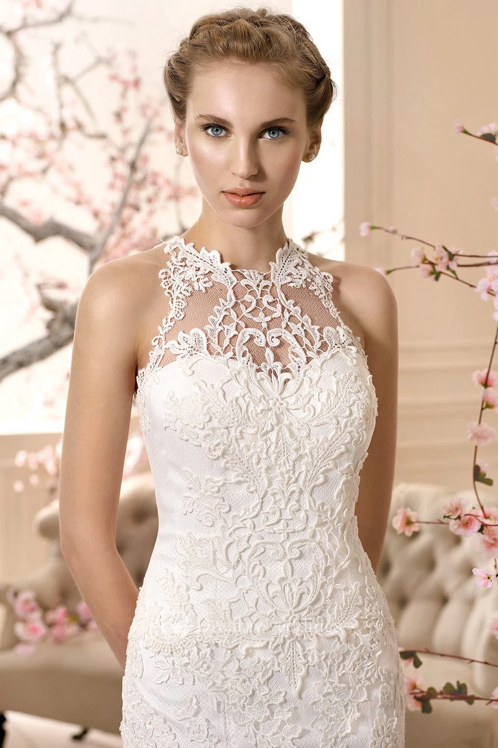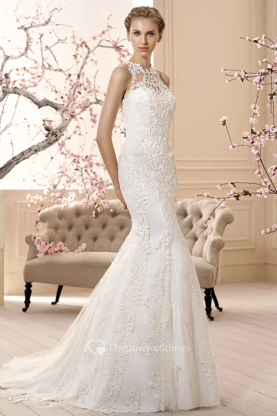 Sheath Sleeveless High-Neck Floor-Length Appliqued Lace Wedding Dress