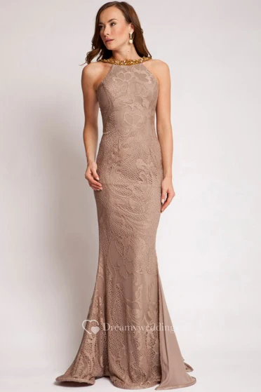 Sheath Sleeveless Long Appliqued Lace Prom Dress With Backless Style And Beading