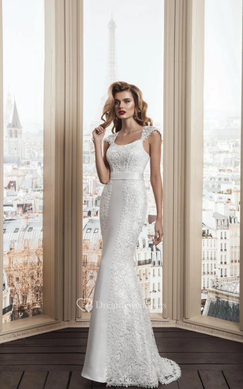 Sheath Strapped Lace Satin Weddig Dress With Lace-Up Back