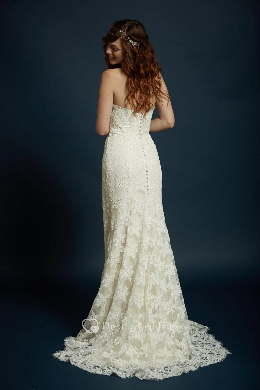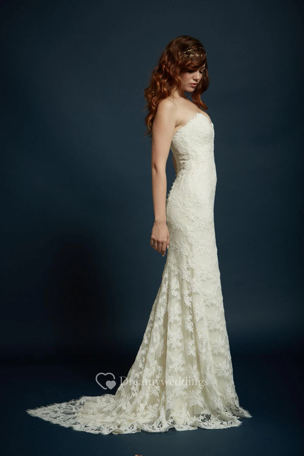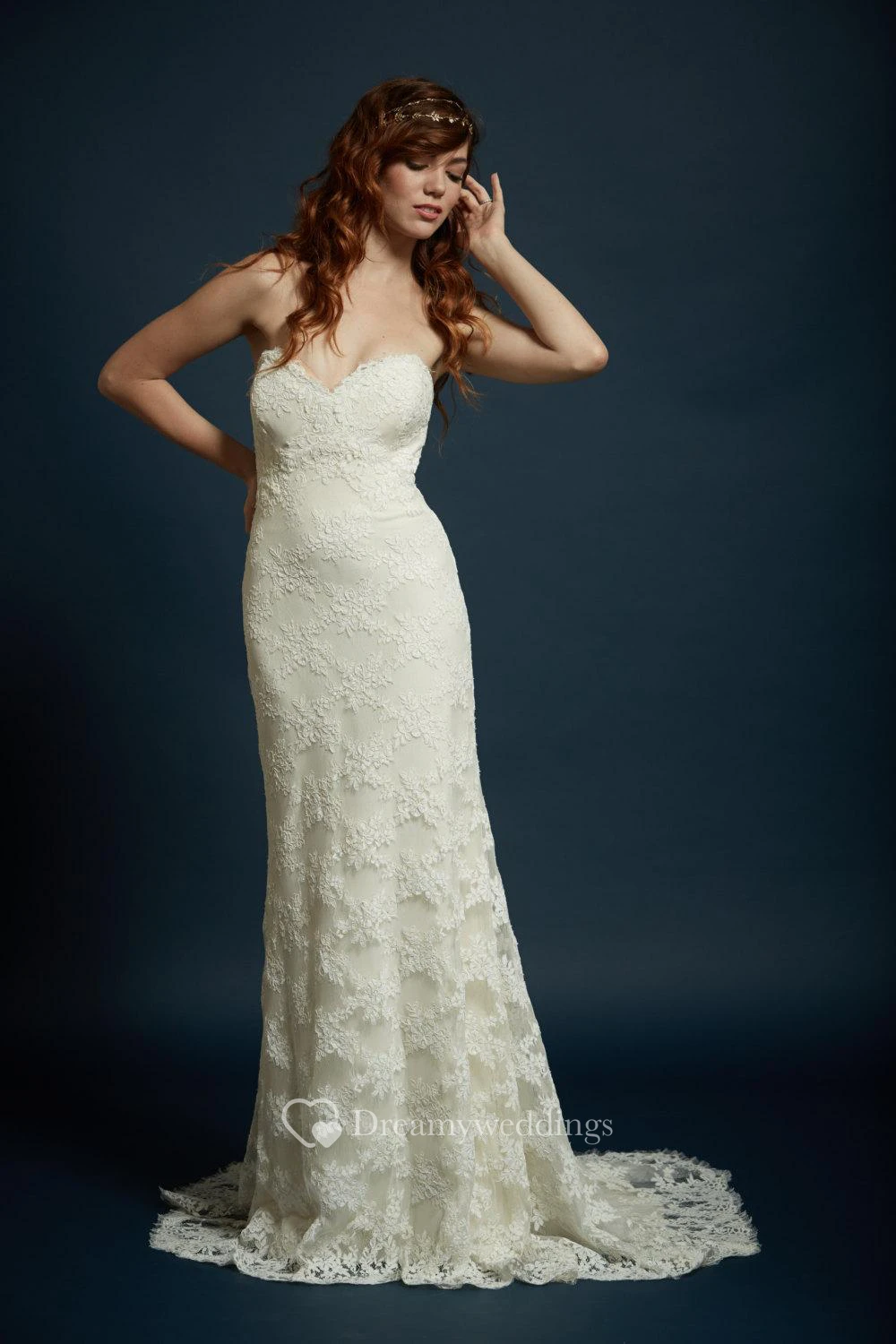 Sheath Sweetheart Strapless Floor Length Lace Gown With Scalloped Train