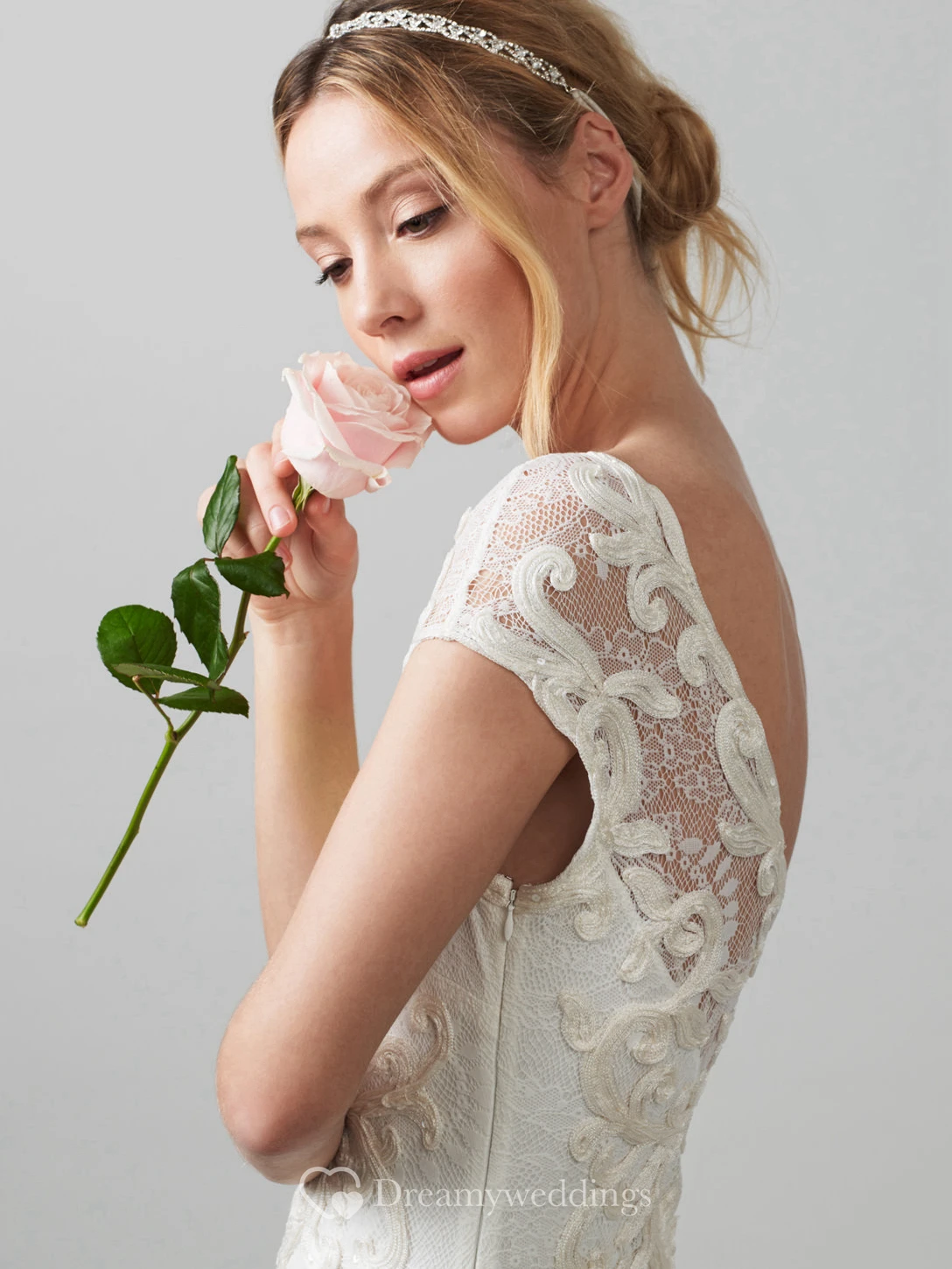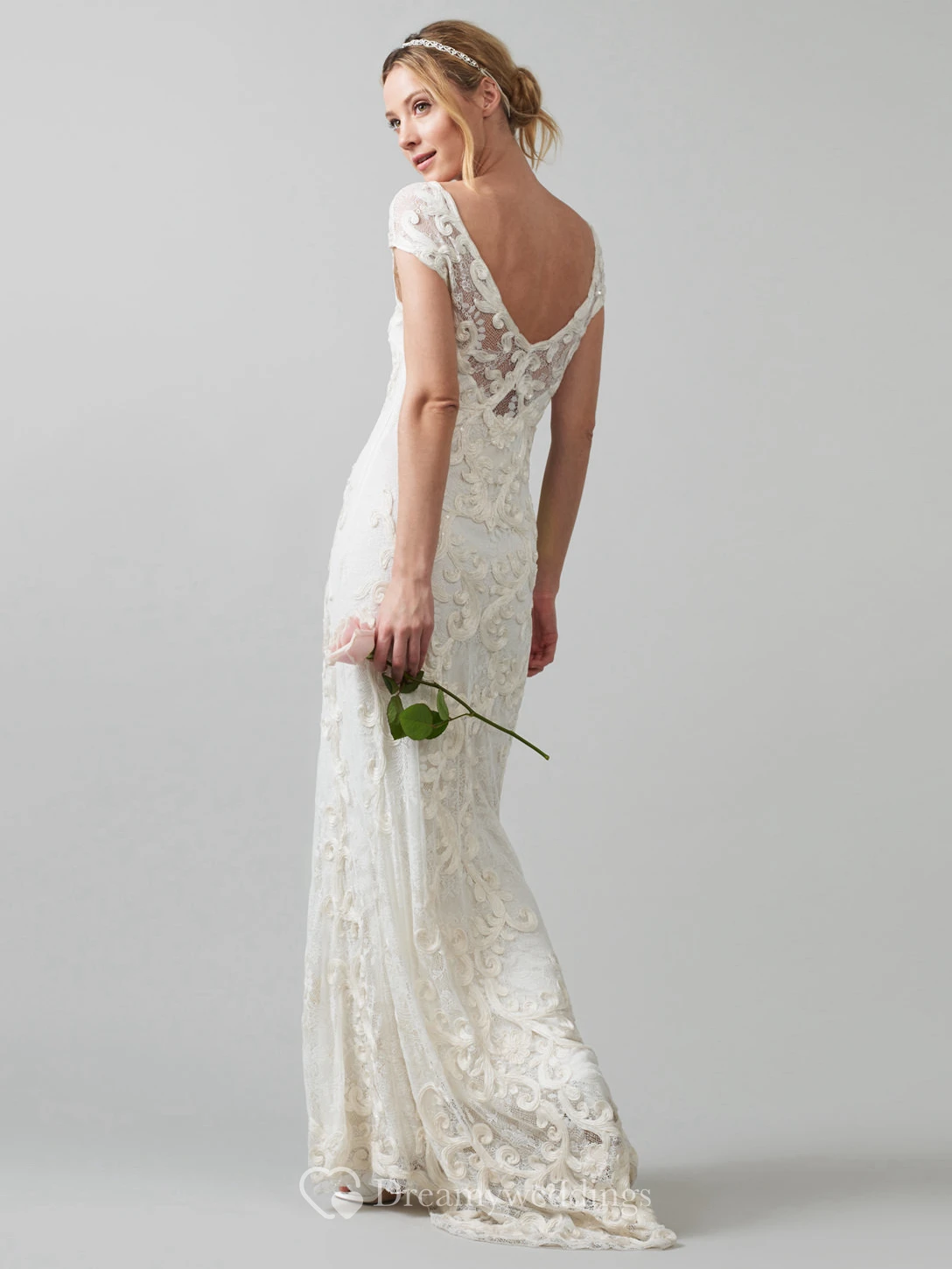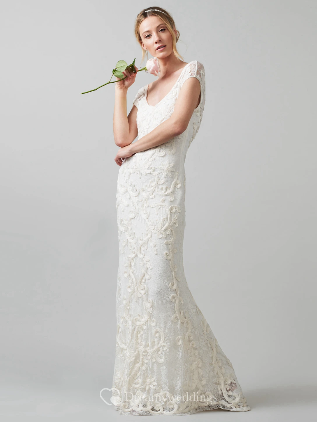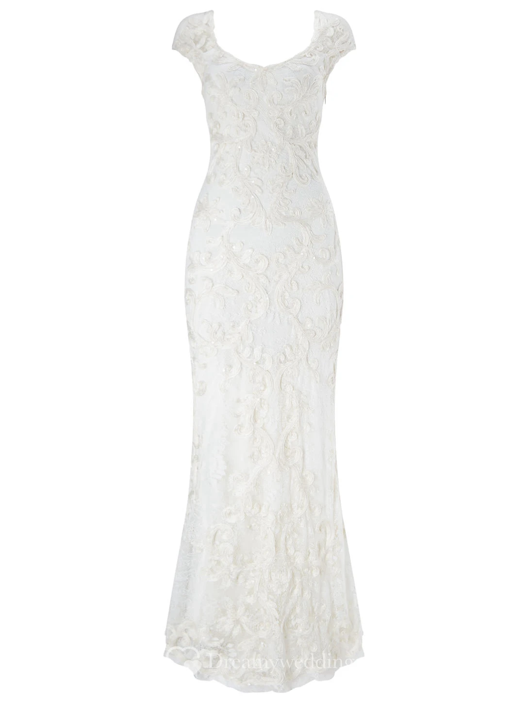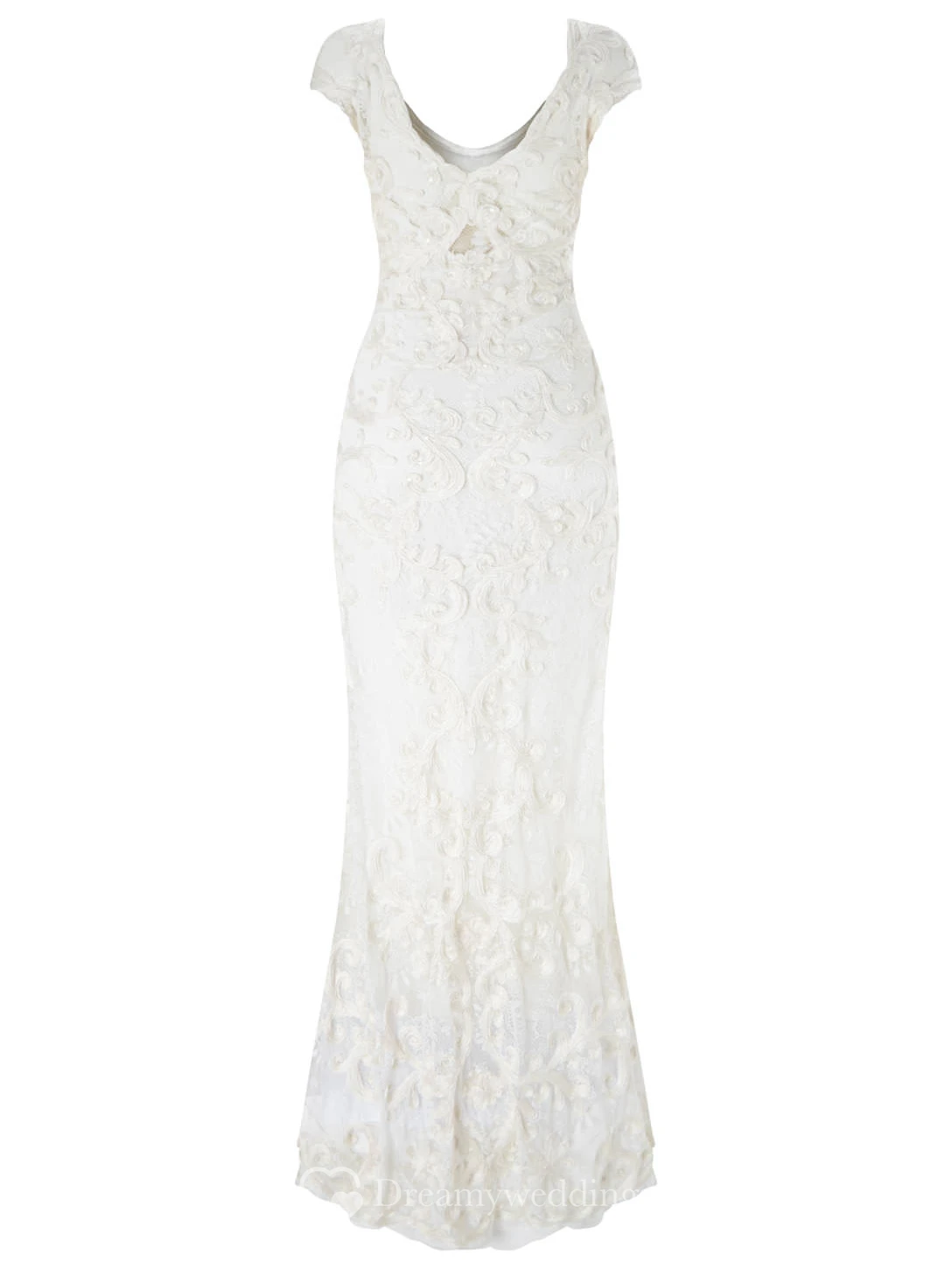 Sheath V-Neck Cap-Sleeve Lace Wedding Dress With Embroidery