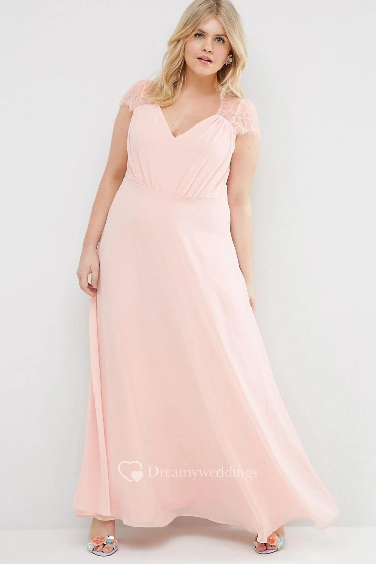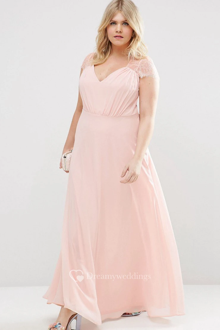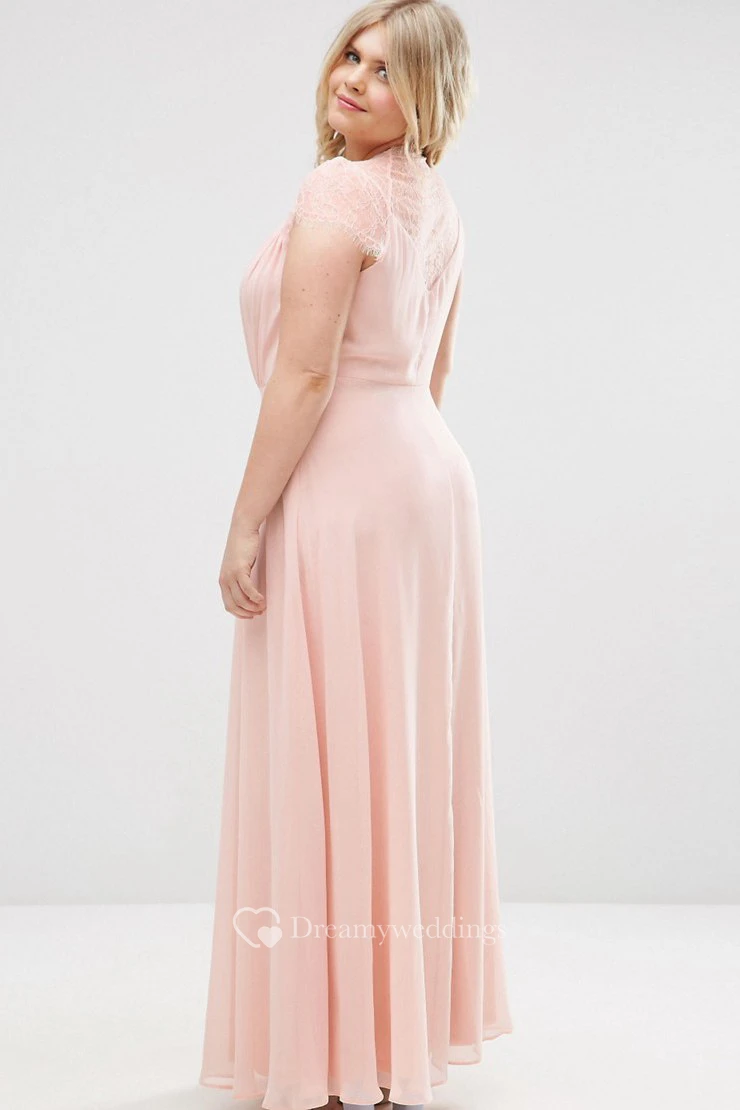Sheath V-Neck Cap-Sleeve Long Chiffon Bridesmaid Dress With Illusion