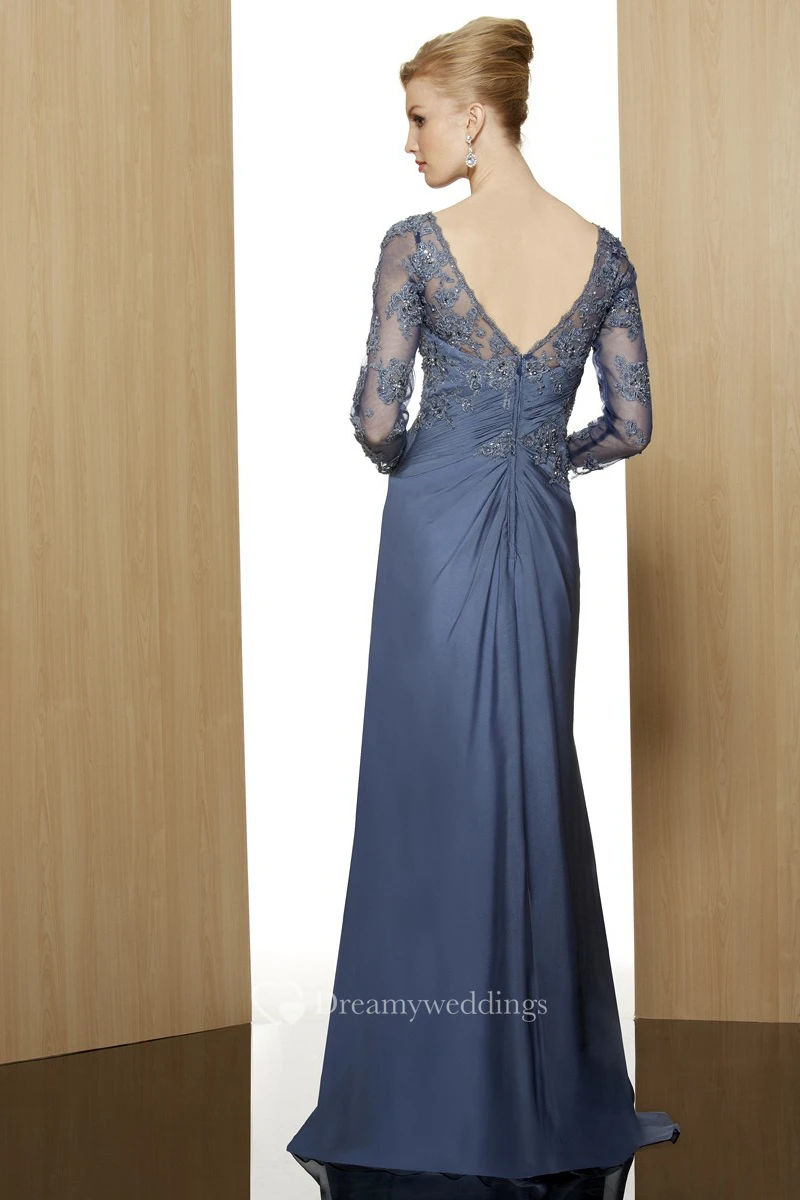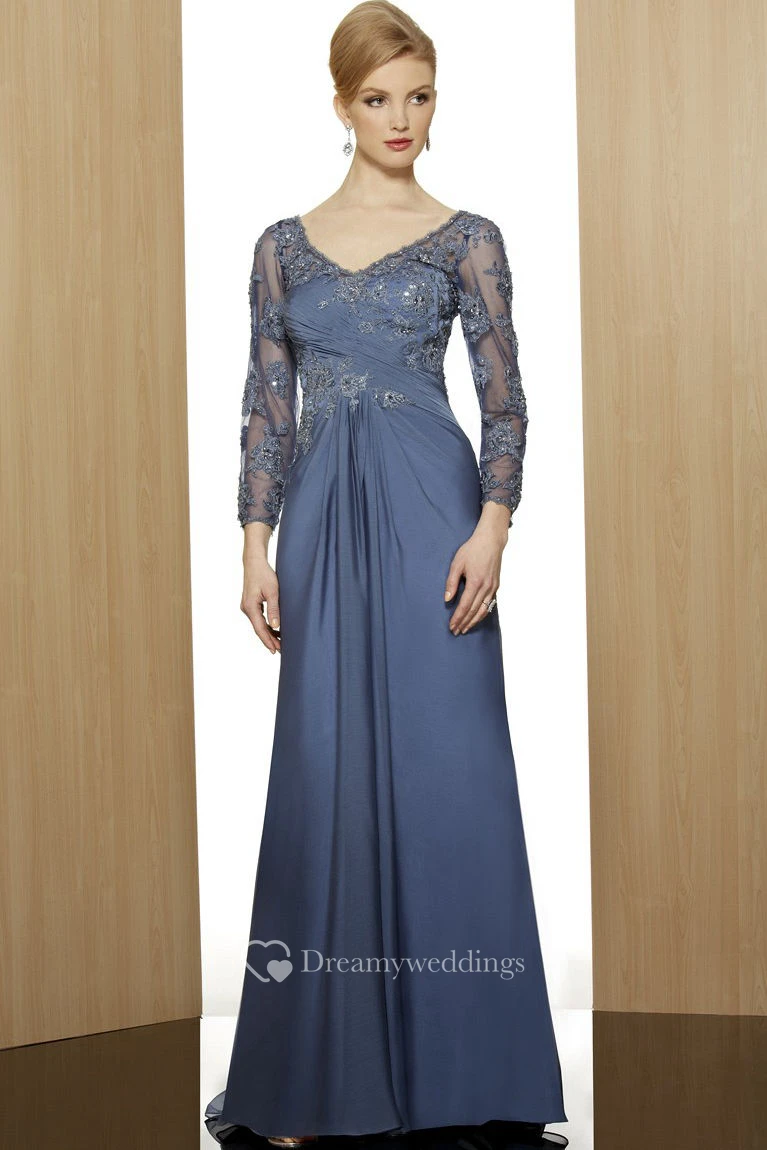 Sheath V-Neck Floor-Length 3-4-Sleeve Appliqued Satin Formal Dress With Beading