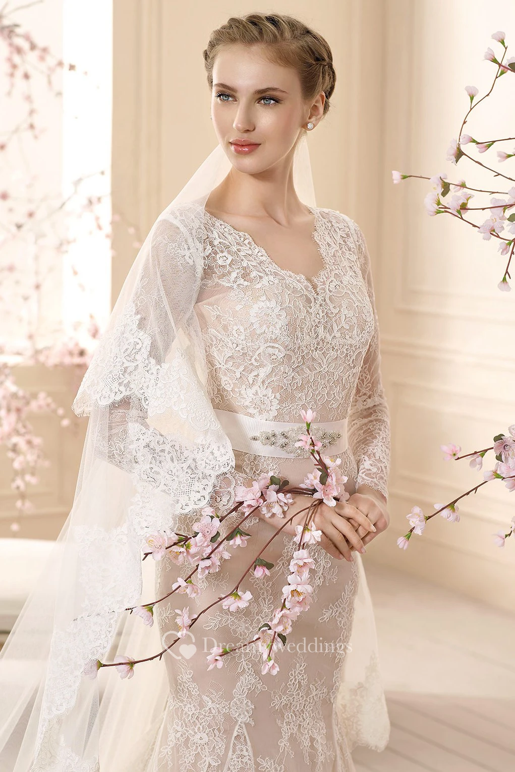 Sheath V-Neck Floor-Length Long-Sleeve Appliqued Lace Wedding Dress With Waist Jewellery And Bow