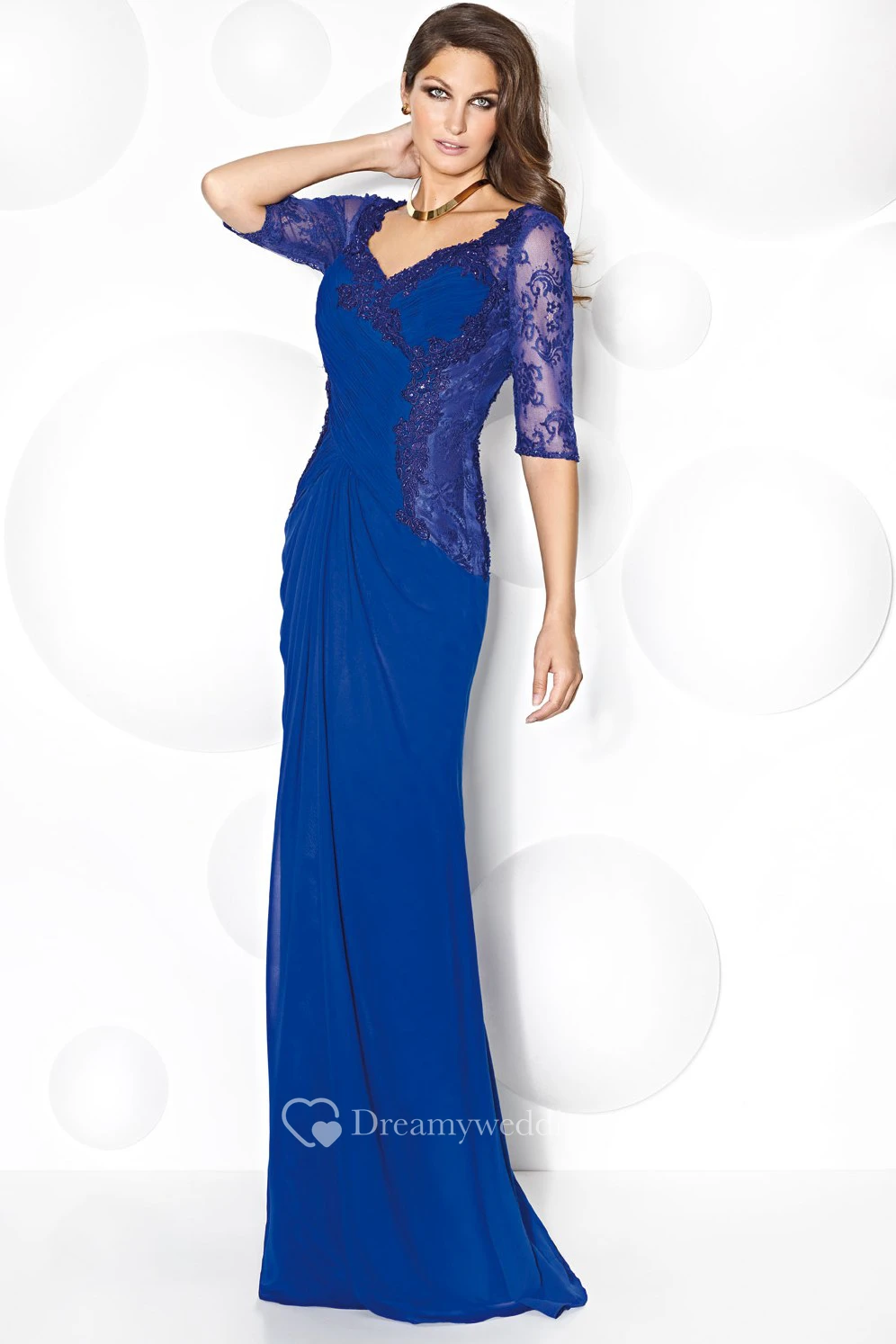 Sheath V-Neck Half Sleeve Appliqued Chiffon Mother Of The Bride Dress With Draping