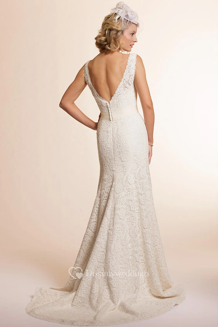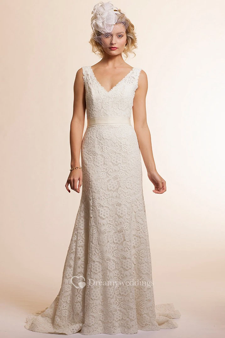 Sheath V-Neck Long-Sleeveless Lace Wedding Dress With V Back