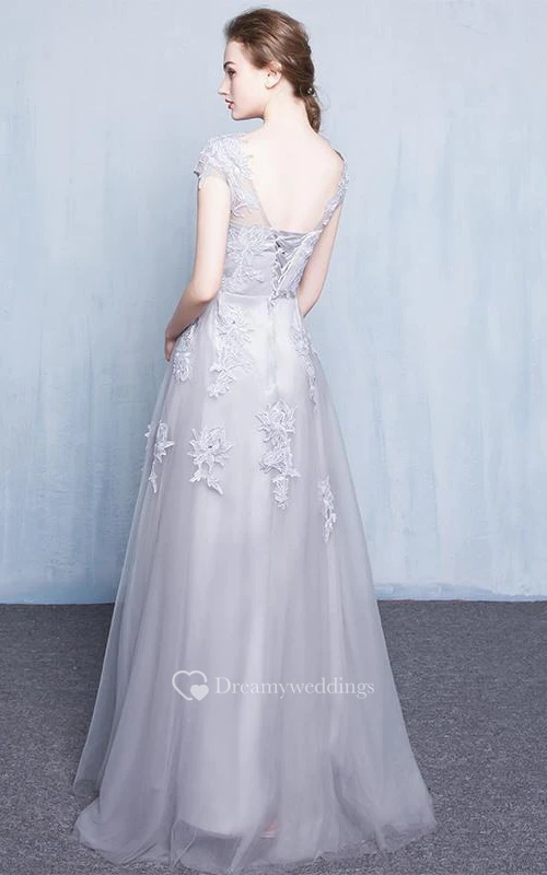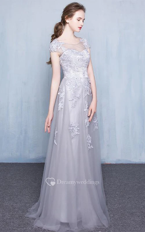 Sheer Neck Appliques Beading Cap Sleeves Prom Dress