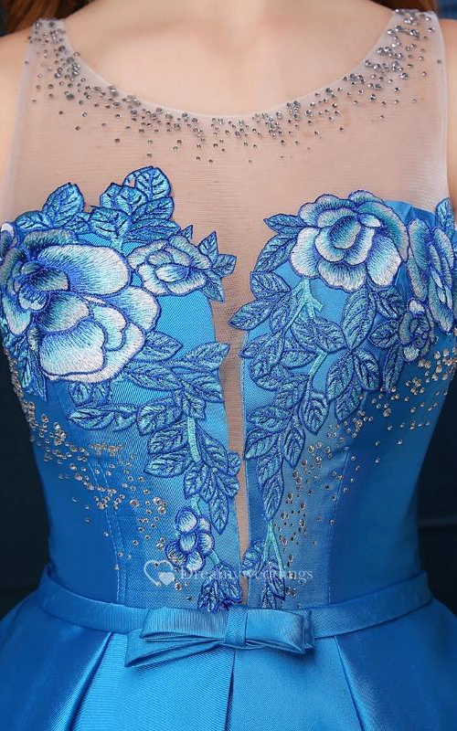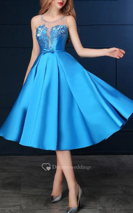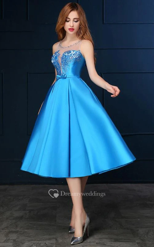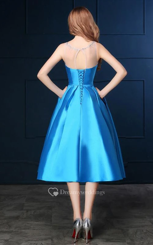 Sheer Neck Beading Sashes Tea-Length Prom Dress