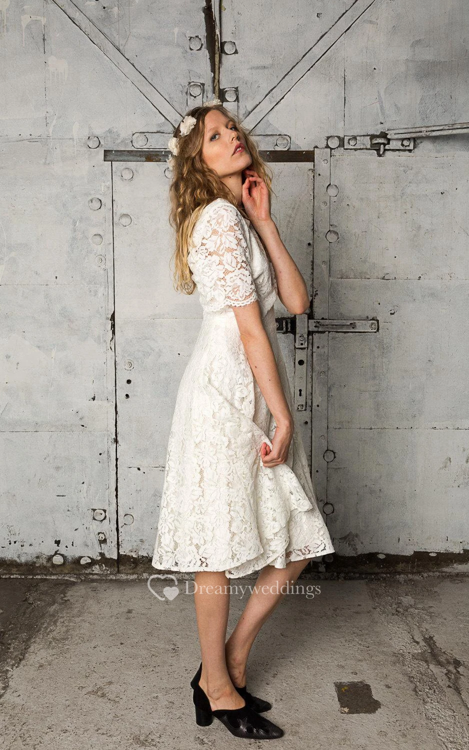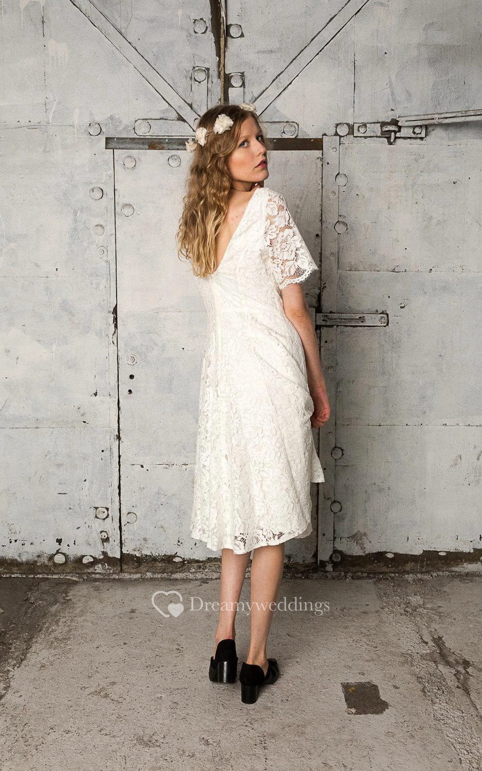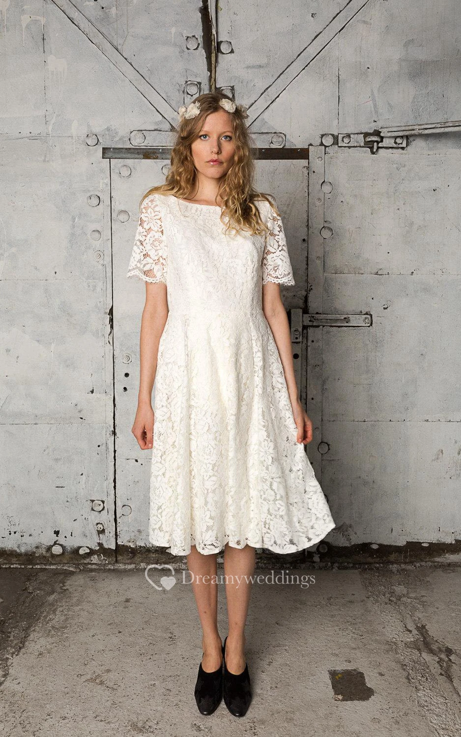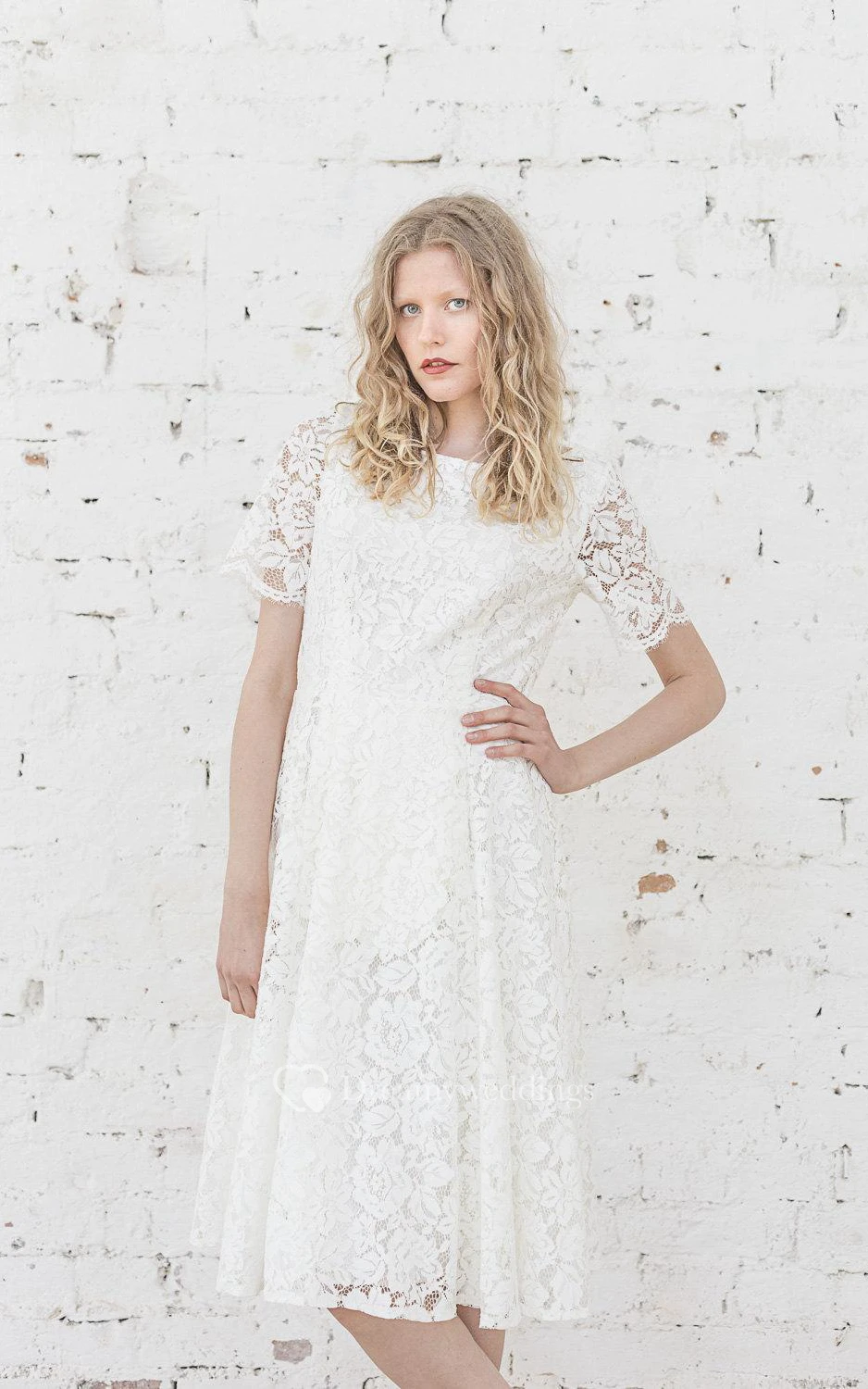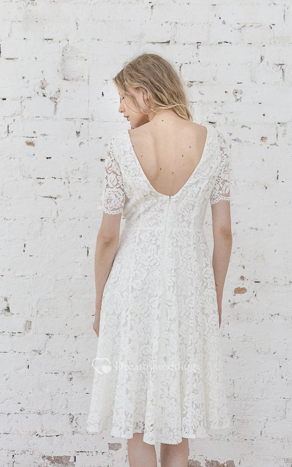 Short Sleeve Lace Knee Length A-Line Dress With Low-V Back