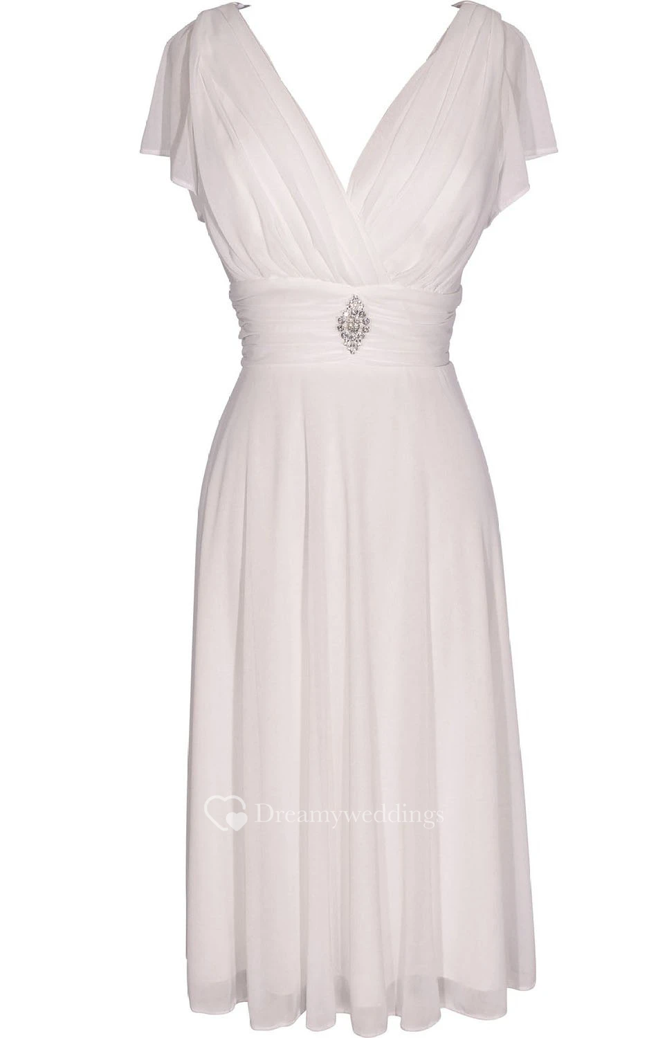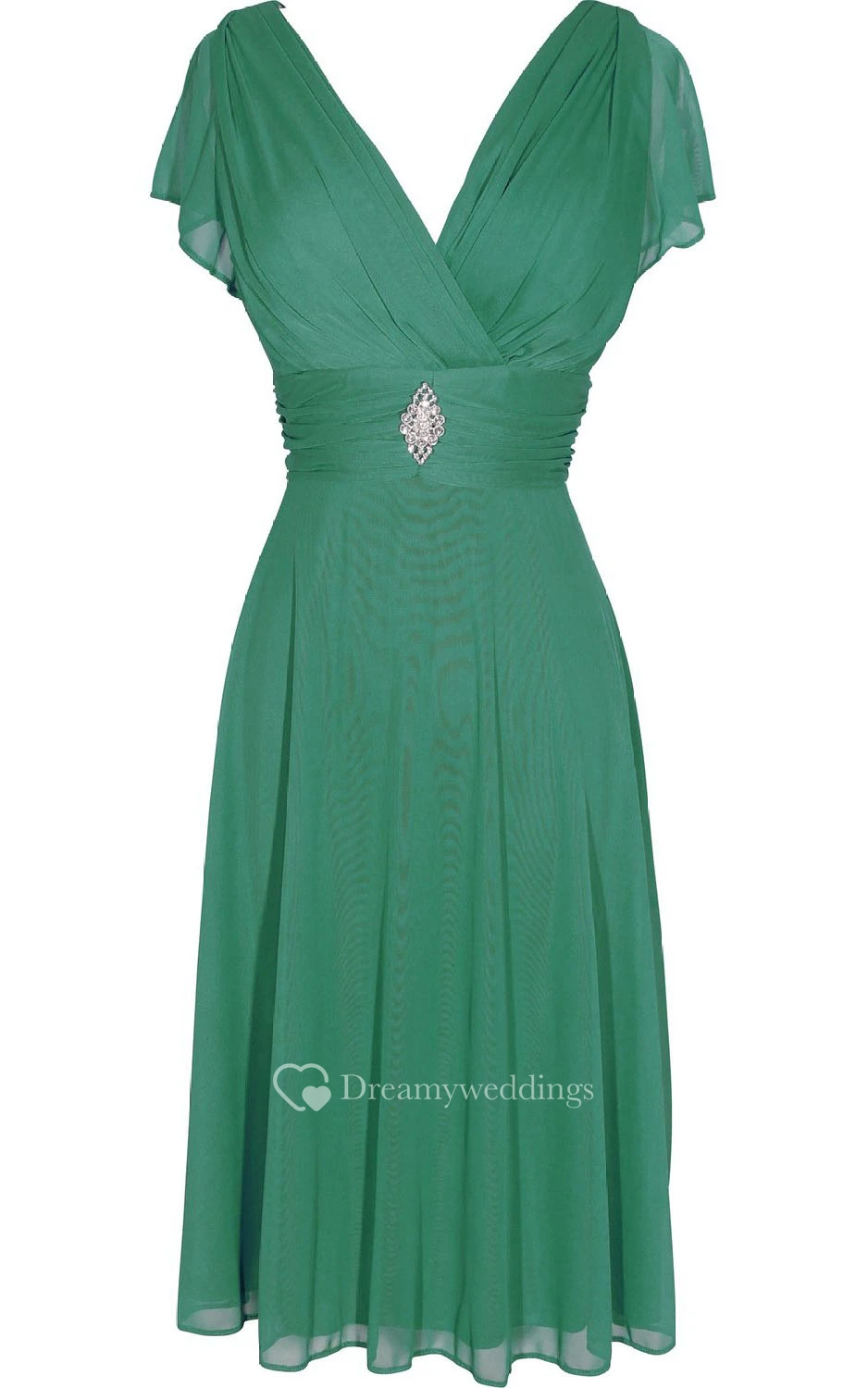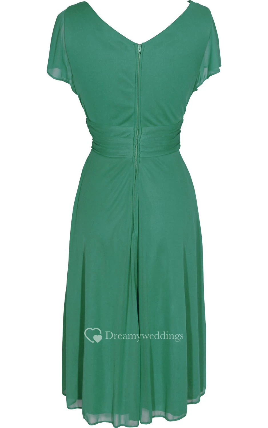 Elegant V neck chiffon knee-length dress with small sleeves is perfect for bridesmaids. It is available in many colors to suit your wedding theme. Moreover, it is priced so less to be affordable. I would recommend this dress to anybody.